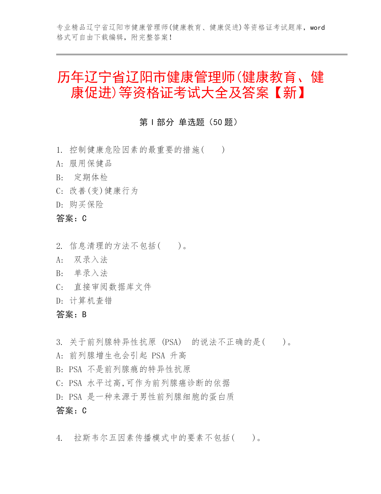 专业精品辽宁省辽阳市健康管理师(健康教育、健康促进)等资格证考试题库,word格式可自由下载编辑,附完整答案!历年辽宁省辽阳市健康管理师(健康教育、健康促进)等资格证考试大全及答案【新】第I部分单选题(50题)1.控制健康危险因素的最重要的措施()A:服用保健品B:定期体检C:改善(变)健康行为D:购买保险答案:C2.信息清理的方法不包括()。A:双录入法B:单录入法C:直接审阅数据库文件D:计算机查错答案:B3.关于前列腺特异性抗原(PSA)的说法不正确的是()。A:前列腺增生也会引起PSA升高B:PS