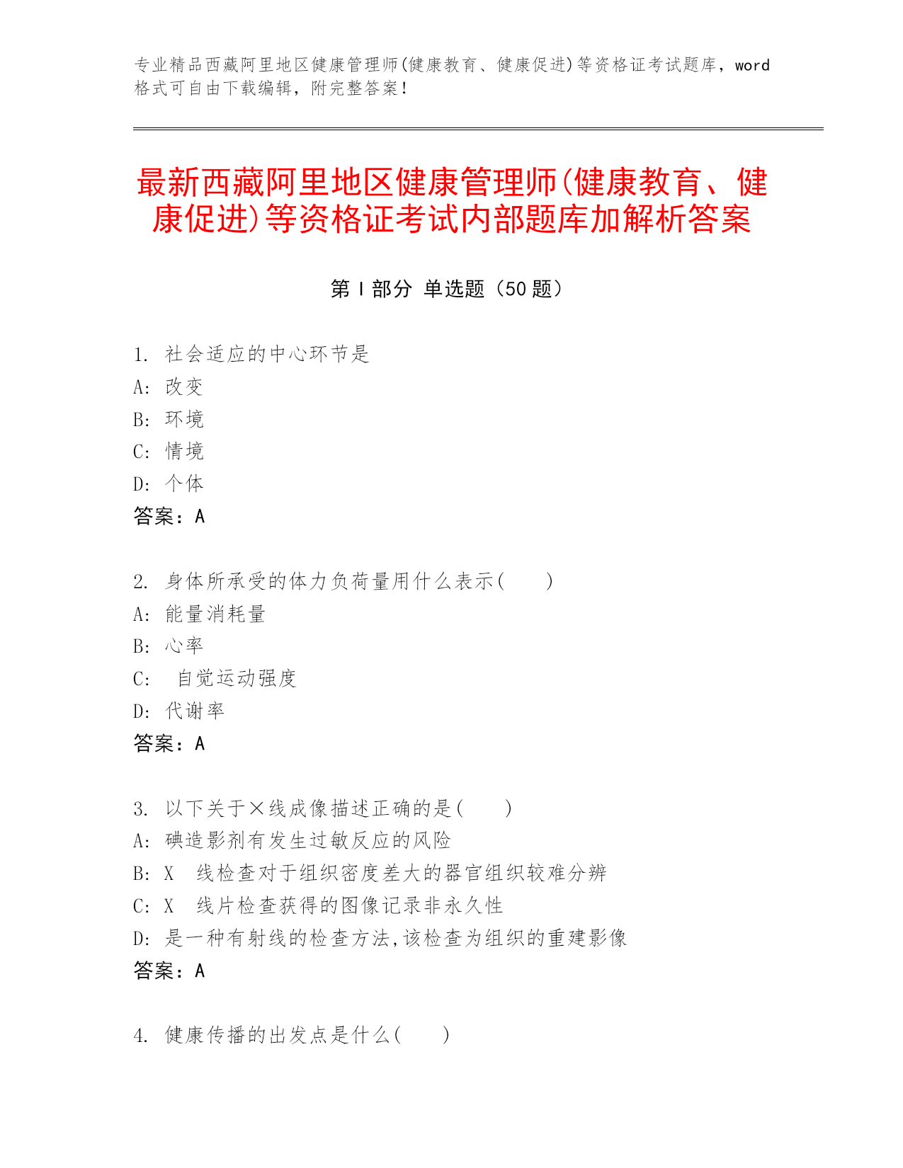 专业精品西藏阿里地区健康管理师(健康教育、健康促进)等资格证考试题库,word格式可自由下载编辑,附完整答案!最新西藏阿里地区健康管理师(健康教育、健康促进)等资格证考试内部题库加解析答案第I部分单选题(50题)1.社会适应的中心环节是A:改变B:环境C:情境D:个体答案:A2.身体所承受的体力负荷量用什么表示()A:能量消耗量B:心率C:自觉运动强度D:代谢率答案:A3.以下关于×线成像描述正确的是()A:碘造影剂有发生过敏反应的风险B:X线检查对于组织密度差大的器官组织较难分辨C:X线片检查获得的图像