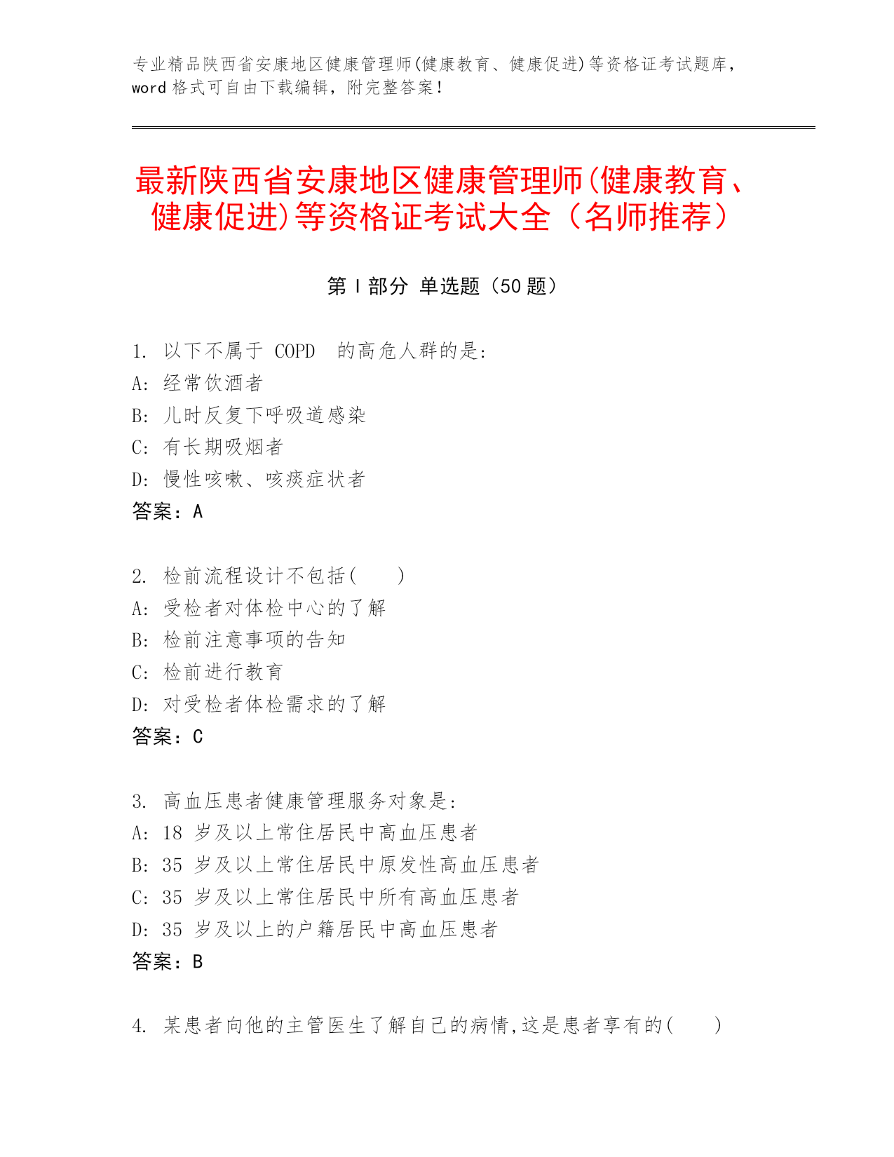 专业精品陕西省安康地区健康管理师(健康教育、健康促进)等资格证考试题库,word格式可自由下载编辑,附完整答案!最新陕西省安康地区健康管理师(健康教育、健康促进)等资格证考试大全(名师推荐)第I部分单选题(50题)1.以下不属于COPD的高危人群的是:A:经常饮酒者B:儿时反复下呼吸道感染C:有长期吸烟者D:慢性咳嗽、咳痰症状者答案:A2.检前流程设计不包括()A:受检者对体检中心的了解B:检前注意事项的告知C:检前进行教育D:对受检者体检需求的了解答案:C3.高血压患者健康管理服务对象是:A:18岁及以