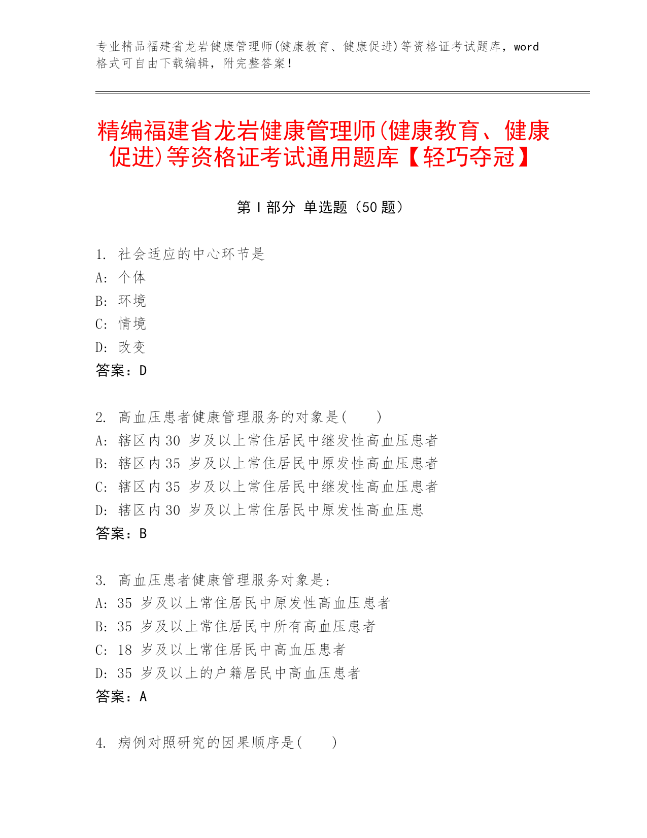 专业精品福建省龙岩健康管理师(健康教育、健康促进)等资格证考试题库,word格式可自由下载编辑,附完整答案!精编福建省龙岩健康管理师(健康教育、健康促进)等资格证考试通用题库【轻巧夺冠】第I部分单选题(50题)1.社会适应的中心环节是A:个体B:环境C:情境D:改变答案:D2.高血压患者健康管理服务的对象是()A:辖区内30岁及以上常住居民中继发性高血压患者B:辖区内35岁及以上常住居民中原发性高血压患者C:辖区内35岁及以上常住居民中继发性高血压患者D:辖区内30岁及以上常住居民中原发性高血压患答案:B