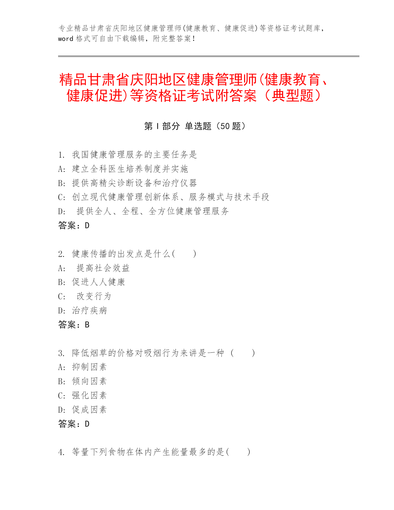 专业精品甘肃省庆阳地区健康管理师(健康教育、健康促进)等资格证考试题库,word格式可自由下载编辑,附完整答案!精品甘肃省庆阳地区健康管理师(健康教育、健康促进)等资格证考试附答案(典型题)第I部分单选题(50题)1.我国健康管理服务的主要任务是A:建立全科医生培养制度并实施B:提供高精尖诊断设备和治疗仪器C:创立现代健康管理创新体系、服务模式与技术手段D:提供全人、全程、全方位健康管理服务答案:D2.健康传播的出发点是什么()A:提高社会效益B:促进人人健康C:改变行为D:治疗疾病答案:B3.降低烟草的