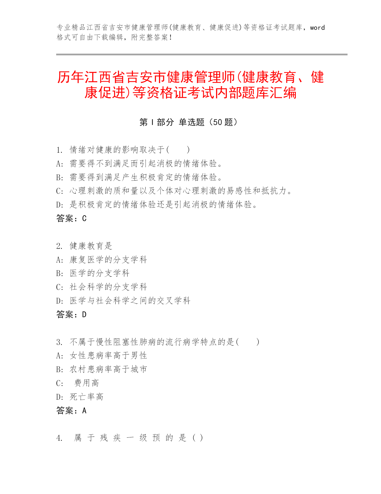 专业精品江西省吉安市健康管理师(健康教育、健康促进)等资格证考试题库,word格式可自由下载编辑,附完整答案!历年江西省吉安市健康管理师(健康教育、健康促进)等资格证考试内部题库汇编第I部分单选题(50题)1.情绪对健康的影响取决于()A:需要得不到满足而引起消极的情绪体验。B:需要得到满足产生积极肯定的情绪体验。C:心理刺激的质和量以及个体对心理刺激的易感性和抵抗力。D:是积极肯定的情绪体验还是引起消极的情绪体验。答案:C2.健康教育是A:康复医学的分支学科B:医学的分支学科C:社会科学的分支学科D:医