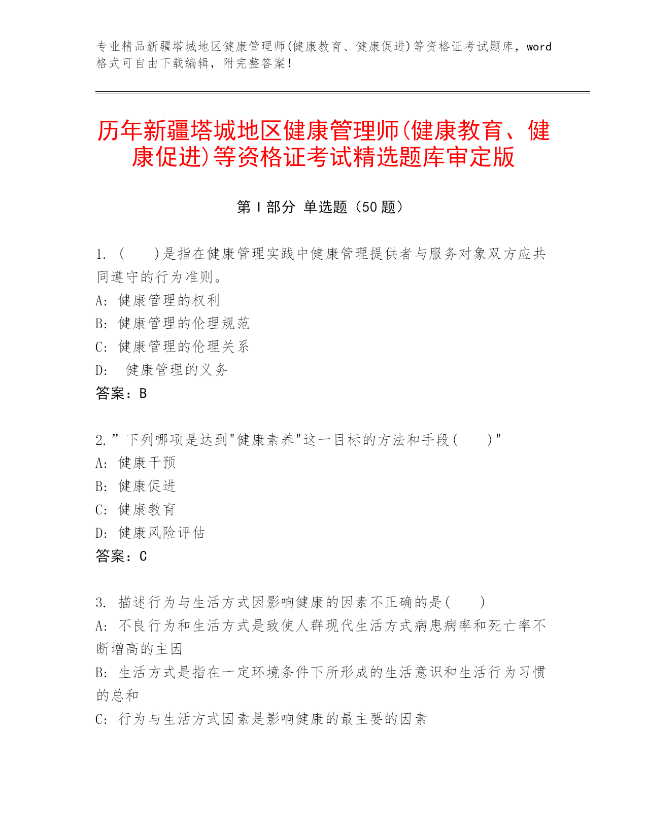 专业精品新疆塔城地区健康管理师(健康教育、健康促进)等资格证考试题库,word格式可自由下载编辑,附完整答案!历年新疆塔城地区健康管理师(健康教育、健康促进)等资格证考试精选题库审定版第I部分单选题(50题)1.()是指在健康管理实践中健康管理提供者与服务对象双方应共同遵守的行为准则。A:健康管理的权利B:健康管理的伦理规范C:健康管理的伦理关系D:健康管理的义务答案:B2.”下列哪项是达到"健康素养"这一目标的方法和手段()"A:健康干预B:健康促进C:健康教育D:健康风险评估答案:C3.描述行为与生活