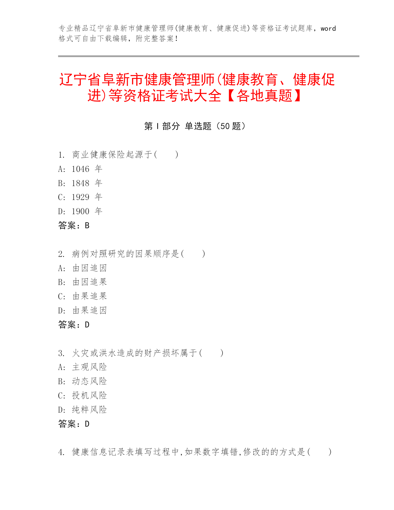 专业精品辽宁省阜新市健康管理师(健康教育、健康促进)等资格证考试题库,word格式可自由下载编辑,附完整答案!辽宁省阜新市健康管理师(健康教育、健康促进)等资格证考试大全【各地真题】第I部分单选题(50题)1.商业健康保险起源于()A:1046年B:1848年C:1929年D:1900年答案:B2.病例对照研究的因果顺序是()A:由因追因B:由因追果C:由果追果D:由果追因答案:D3.火灾或洪水造成的财产损坏属于()A:主观风险B:动态风险C:投机风险D:纯粹风险答案:D4.健康信息记录表填写过程中,如果