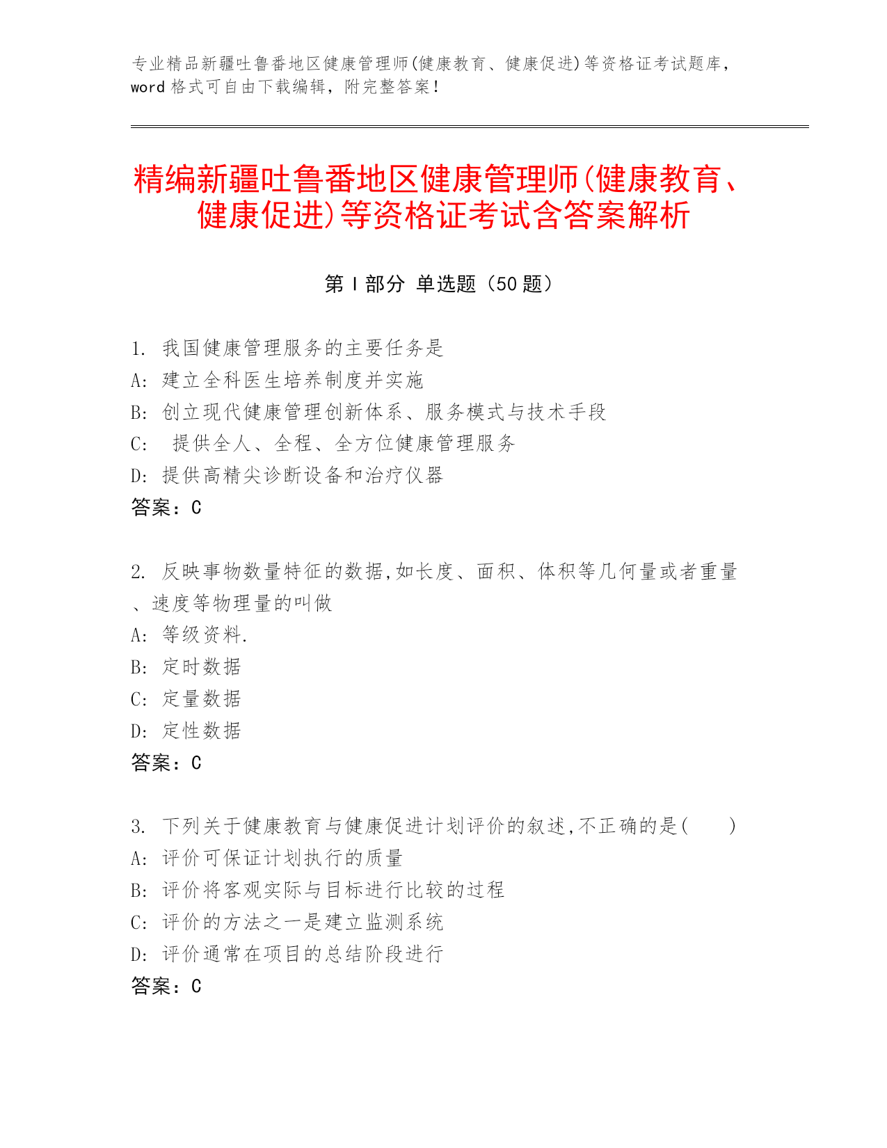 专业精品新疆吐鲁番地区健康管理师(健康教育、健康促进)等资格证考试题库,word格式可自由下载编辑,附完整答案!精编新疆吐鲁番地区健康管理师(健康教育、健康促进)等资格证考试含答案解析第I部分单选题(50题)1.我国健康管理服务的主要任务是A:建立全科医生培养制度并实施B:创立现代健康管理创新体系、服务模式与技术手段C:提供全人、全程、全方位健康管理服务D:提供高精尖诊断设备和治疗仪器答案:C2.反映事物数量特征的数据,如长度、面积、体积等几何量或者重量、速度等物理量的叫做A:等级资料.B:定时数据C:定