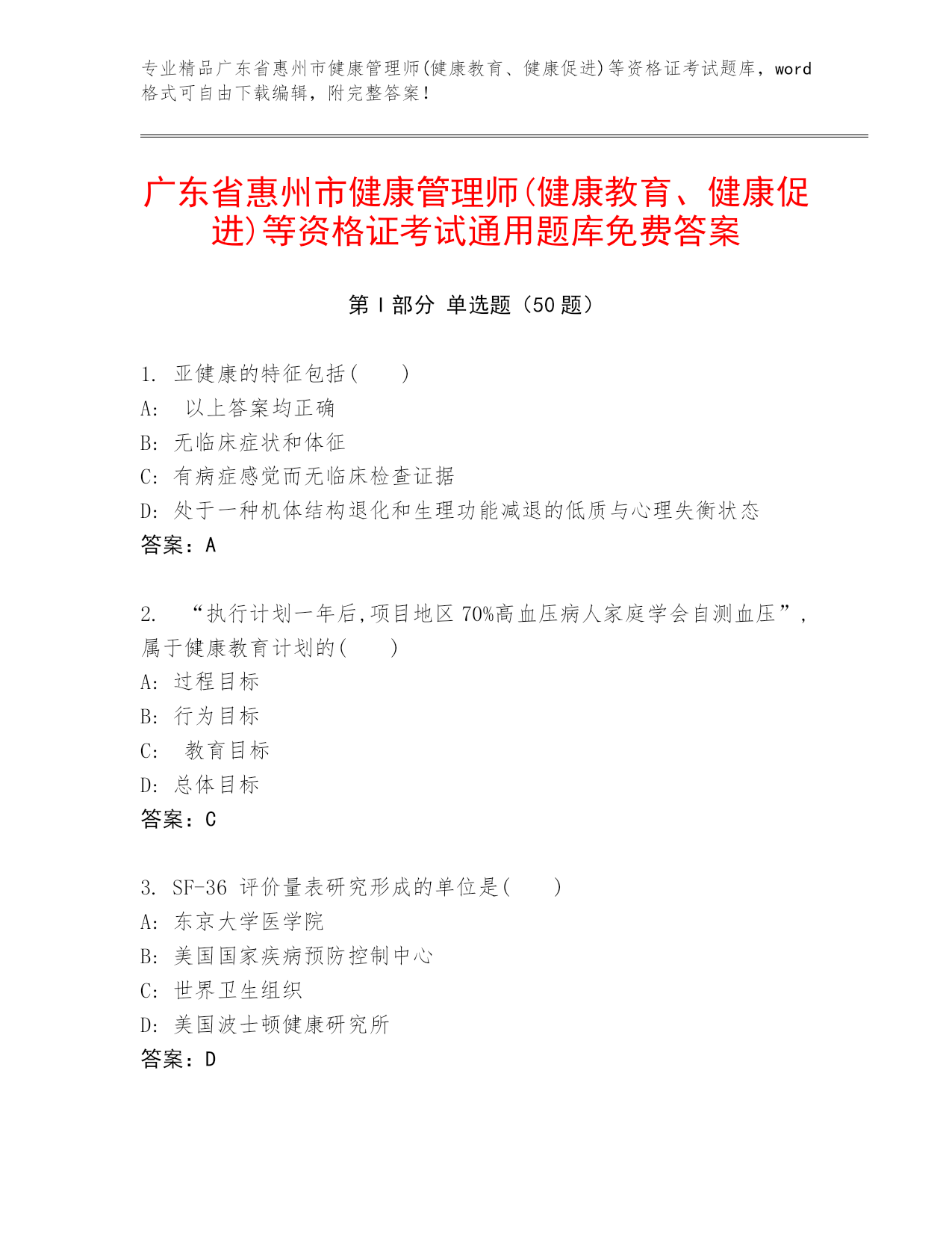 专业精品广东省惠州市健康管理师(健康教育、健康促进)等资格证考试题库,word格式可自由下载编辑,附完整答案!广东省惠州市健康管理师(健康教育、健康促进)等资格证考试通用题库免费答案第I部分单选题(50题)1.亚健康的特征包括()A:以上答案均正确B:无临床症状和体征C:有病症感觉而无临床检查证据D:处于一种机体结构退化和生理功能减退的低质与心理失衡状态答案:A2.“执行计划一年后,项目地区70%高血压病人家庭学会自测血压”,属于健康教育计划的()A:过程目标B:行为目标C:教育目标D:总体目标答案:C3
