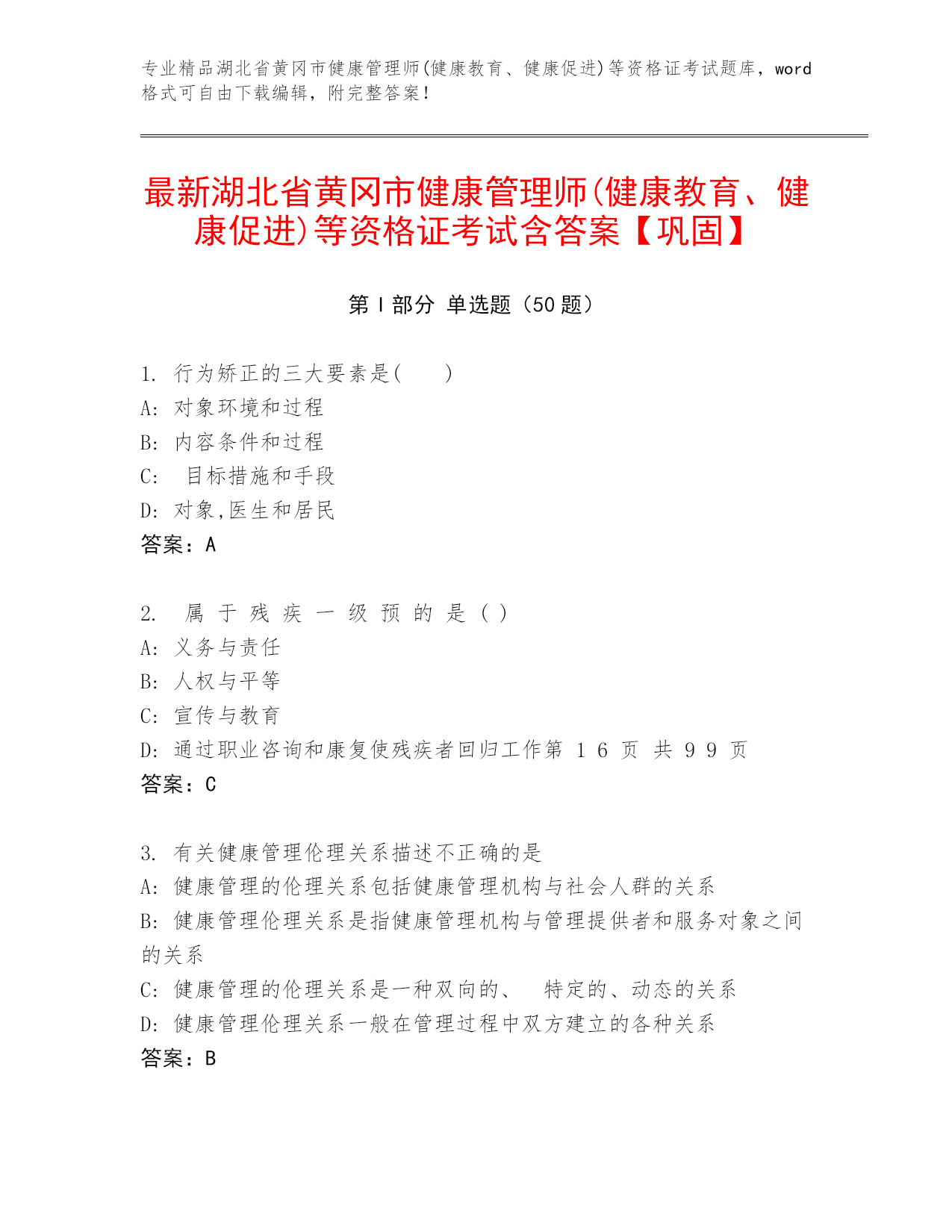 最新湖北省黄冈市健康管理师(健康教育、健康促进)等资格证考试含答案【巩固】.docx