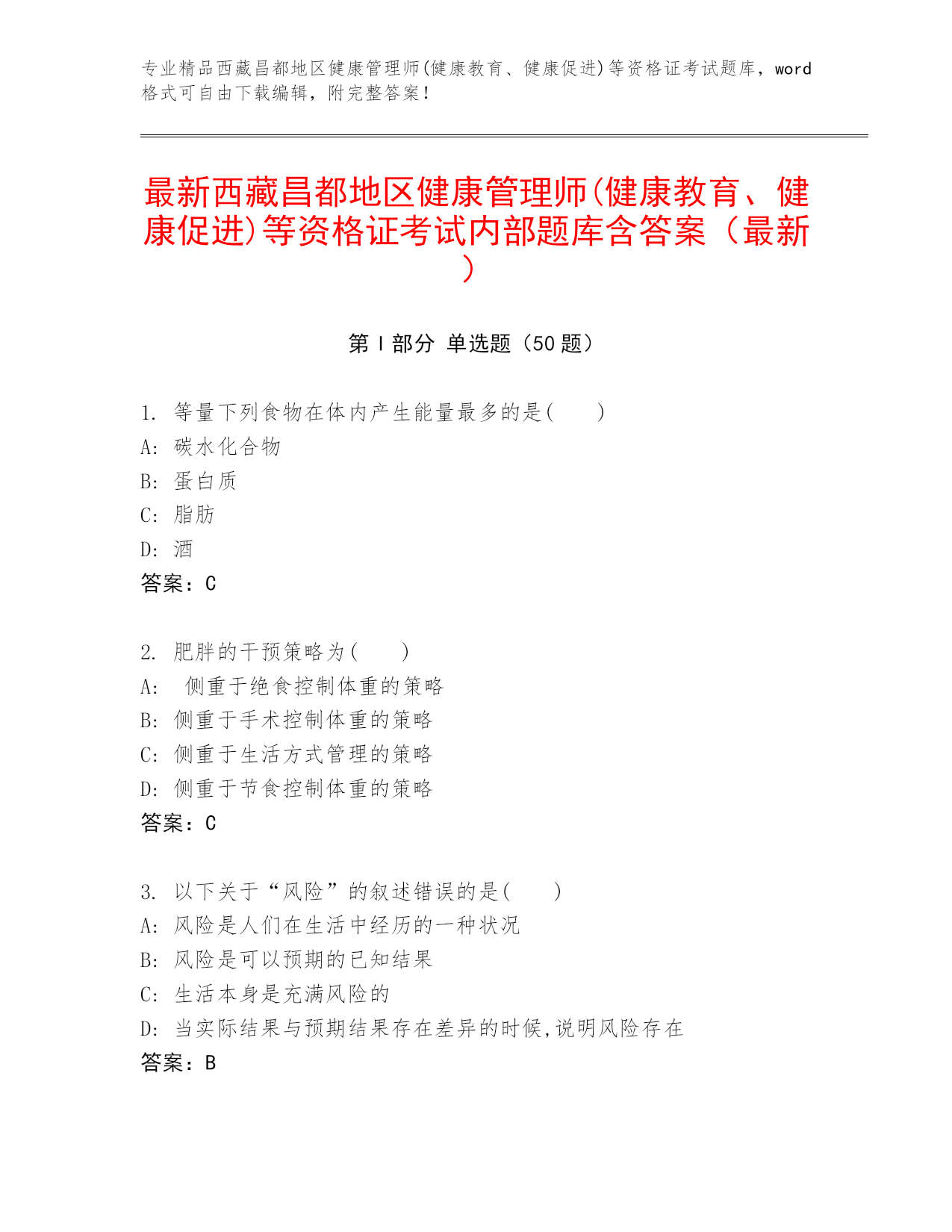 最新西藏昌都地区健康管理师(健康教育、健康促进)等资格证考试内部题库含答案(最新).docx