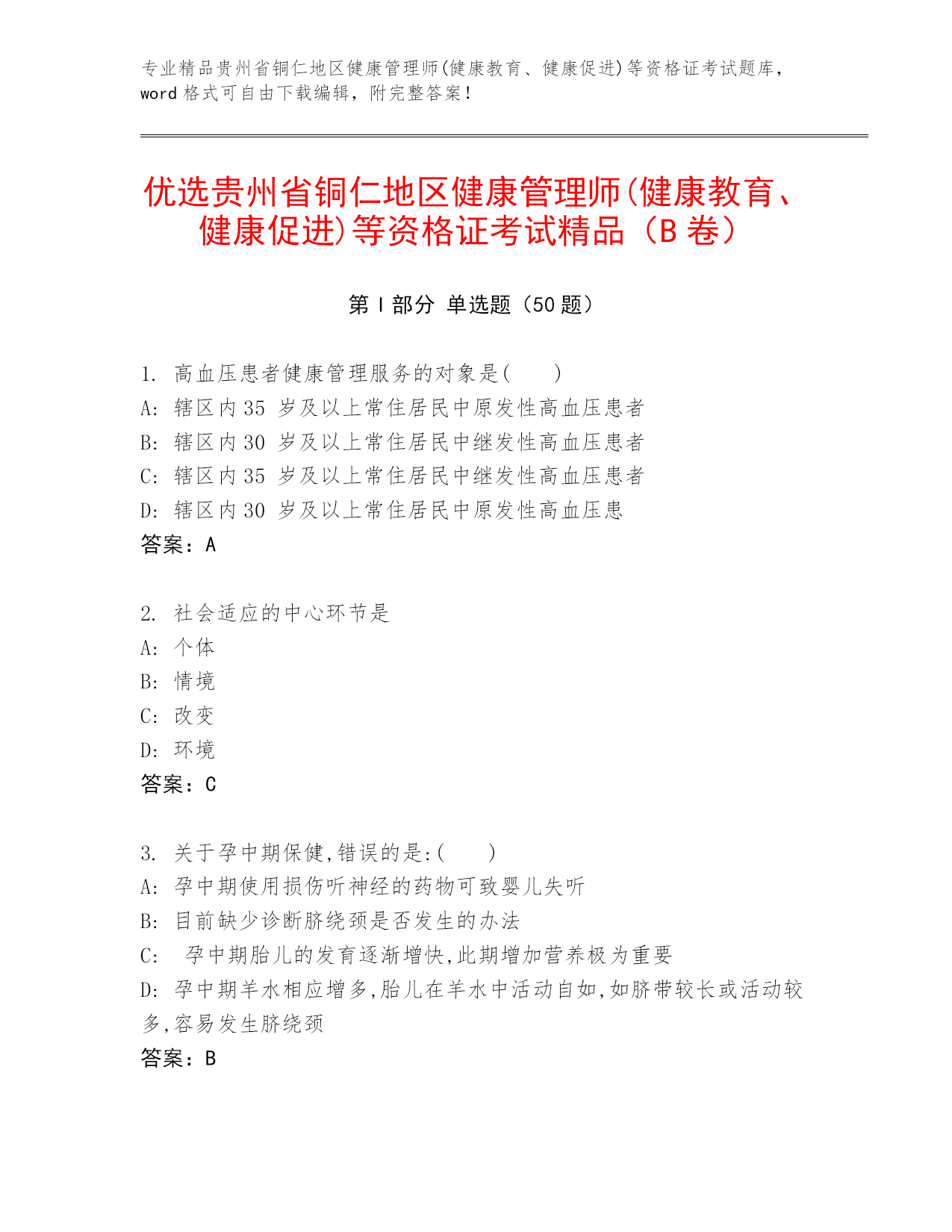 优选贵州省铜仁地区健康管理师(健康教育、健康促进)等资格证考试精品(B卷).docx
