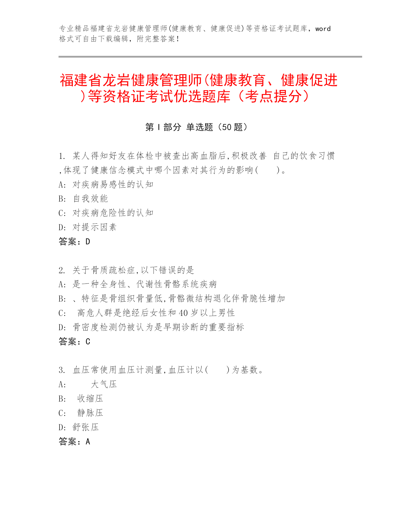 福建省龙岩健康管理师(健康教育、健康促进)等资格证考试优选题库(考点提分).docx
