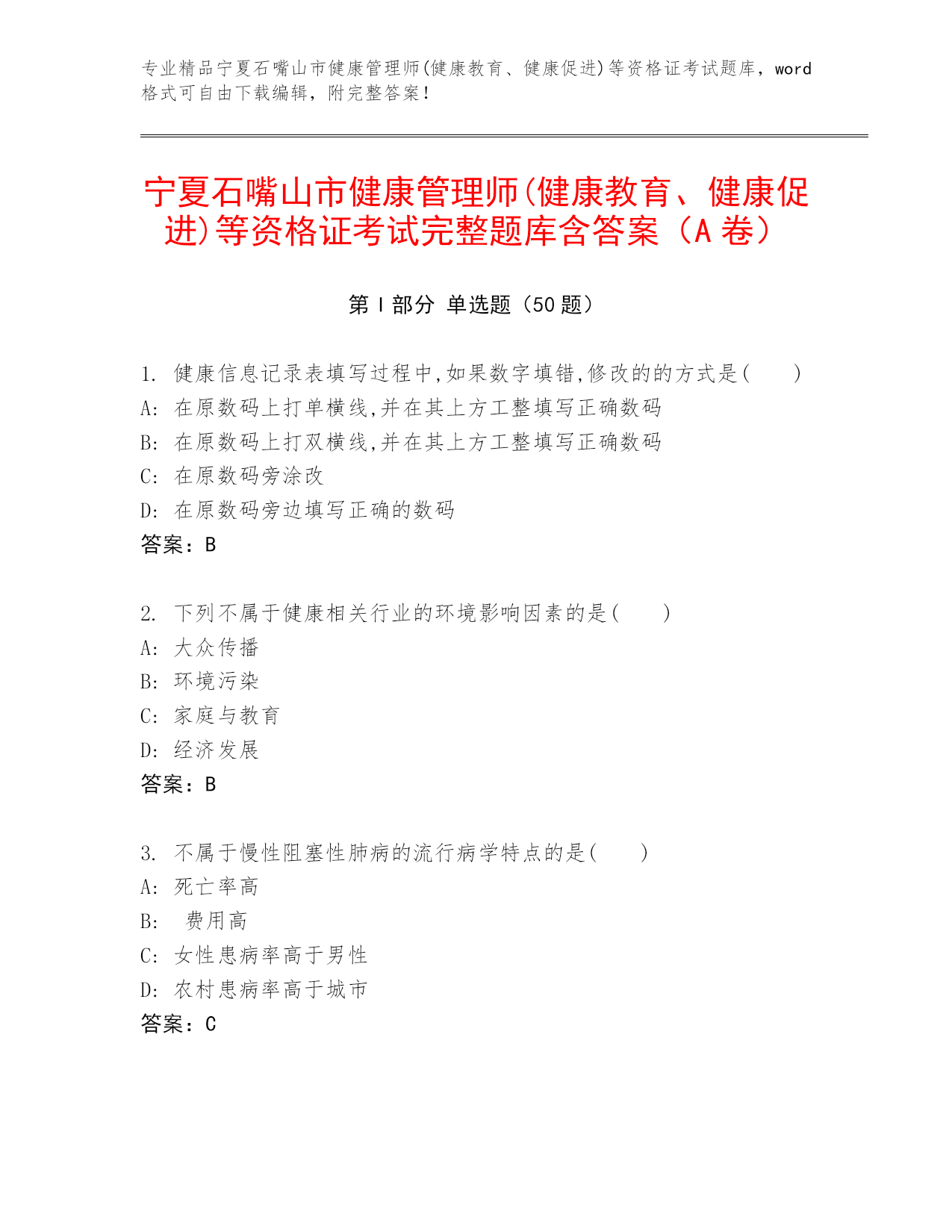 宁夏石嘴山市健康管理师(健康教育、健康促进)等资格证考试完整题库含答案(A卷).docx