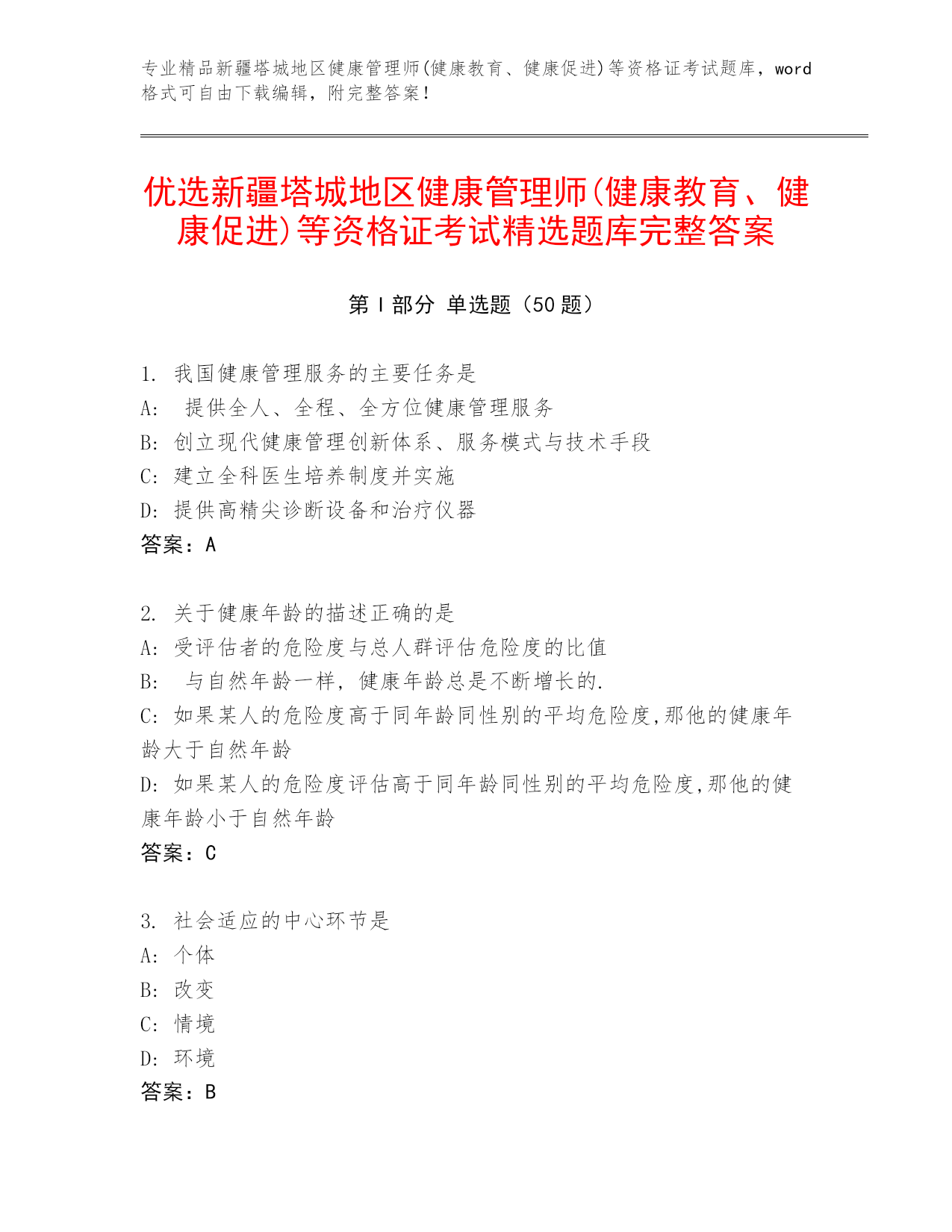 专业精品新疆塔城地区健康管理师(健康教育、健康促进)等资格证考试题库,word格式可自由下载编辑,附完整答案!优选新疆塔城地区健康管理师(健康教育、健康促进)等资格证考试精选题库完整答案第I部分单选题(50题)1.我国健康管理服务的主要任务是A:提供全人、全程、全方位健康管理服务B:创立现代健康管理创新体系、服务模式与技术手段C:建立全科医生培养制度并实施D:提供高精尖诊断设备和治疗仪器答案:A2.关于健康年龄的描述正确的是A:受评估者的危险度与总人群评估危险度的比值B:与自然年龄一样,健康年龄总是不断增