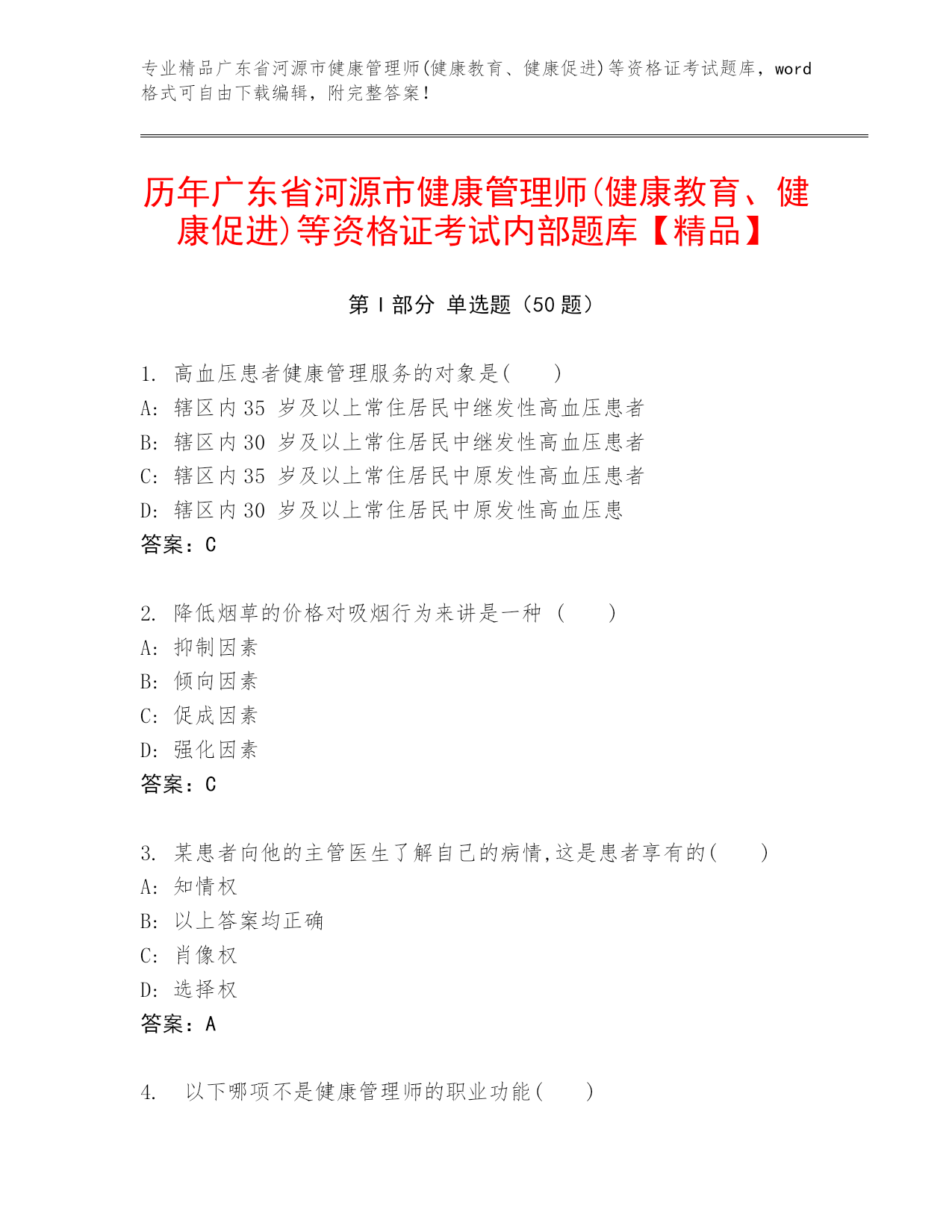 专业精品广东省河源市健康管理师(健康教育、健康促进)等资格证考试题库,word格式可自由下载编辑,附完整答案!历年广东省河源市健康管理师(健康教育、健康促进)等资格证考试内部题库【精品】第I部分单选题(50题)1.高血压患者健康管理服务的对象是()A:辖区内35岁及以上常住居民中继发性高血压患者B:辖区内30岁及以上常住居民中继发性高血压患者C:辖区内35岁及以上常住居民中原发性高血压患者D:辖区内30岁及以上常住居民中原发性高血压患答案:C2.降低烟草的价格对吸烟行为来讲是一种()A:抑制因素B:倾向因