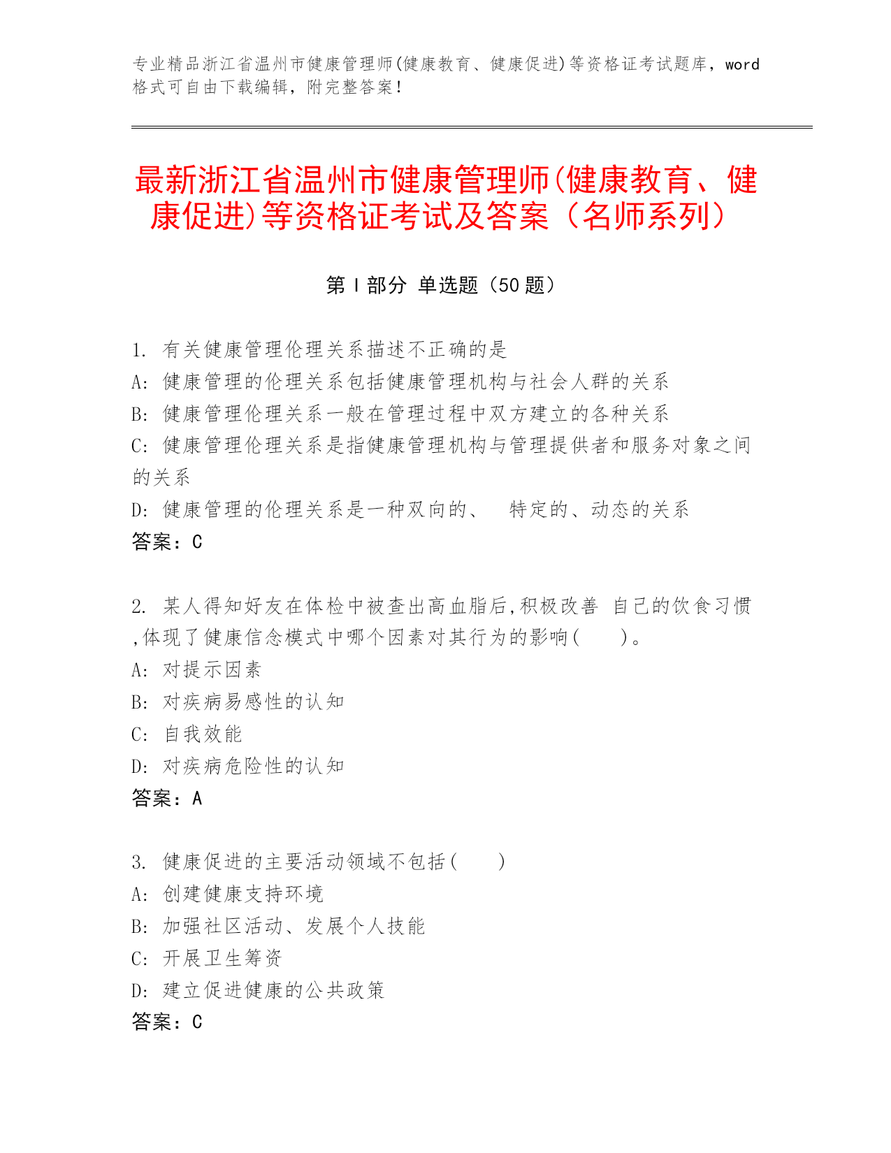 专业精品浙江省温州市健康管理师(健康教育、健康促进)等资格证考试题库,word格式可自由下载编辑,附完整答案!最新浙江省温州市健康管理师(健康教育、健康促进)等资格证考试及答案(名师系列)第I部分单选题(50题)1.有关健康管理伦理关系描述不正确的是A:健康管理的伦理关系包括健康管理机构与社会人群的关系B:健康管理伦理关系一般在管理过程中双方建立的各种关系C:健康管理伦理关系是指健康管理机构与管理提供者和服务对象之间的关系D:健康管理的伦理关系是一种双向的、特定的、动态的关系答案:C2.某人得知好友在体检
