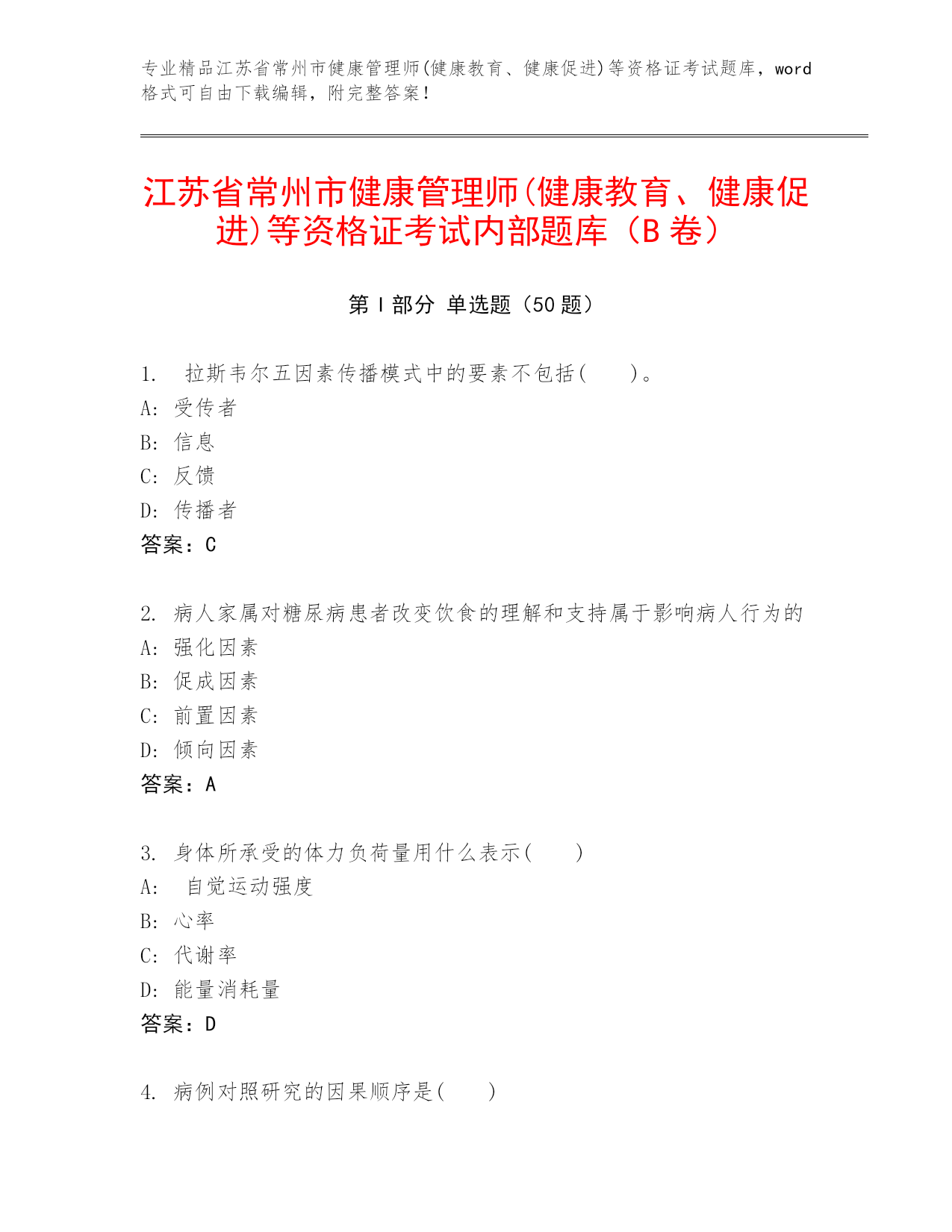 专业精品江苏省常州市健康管理师(健康教育、健康促进)等资格证考试题库,word格式可自由下载编辑,附完整答案!江苏省常州市健康管理师(健康教育、健康促进)等资格证考试内部题库(B卷)第I部分单选题(50题)1.拉斯韦尔五因素传播模式中的要素不包括()。A:受传者B:信息C:反馈D:传播者答案:C2.病人家属对糖尿病患者改变饮食的理解和支持属于影响病人行为的A:强化因素B:促成因素C:前置因素D:倾向因素答案:A3.身体所承受的体力负荷量用什么表示()A:自觉运动强度B:心率C:代谢率D:能量消耗量答案:D