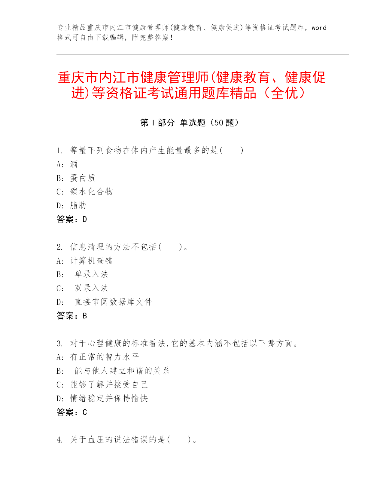 专业精品重庆市内江市健康管理师(健康教育、健康促进)等资格证考试题库,word格式可自由下载编辑,附完整答案!重庆市内江市健康管理师(健康教育、健康促进)等资格证考试通用题库精品(全优)第I部分单选题(50题)1.等量下列食物在体内产生能量最多的是()A:酒B:蛋白质C:碳水化合物D:脂肪答案:D2.信息清理的方法不包括()。A:计算机查错B:单录入法C:双录入法D:直接审阅数据库文件答案:B3.对于心理健康的标准看法,它的基本内涵不包括以下哪方面。A:有正常的智力水平B:能与他人建立和谐的关系C:能够了