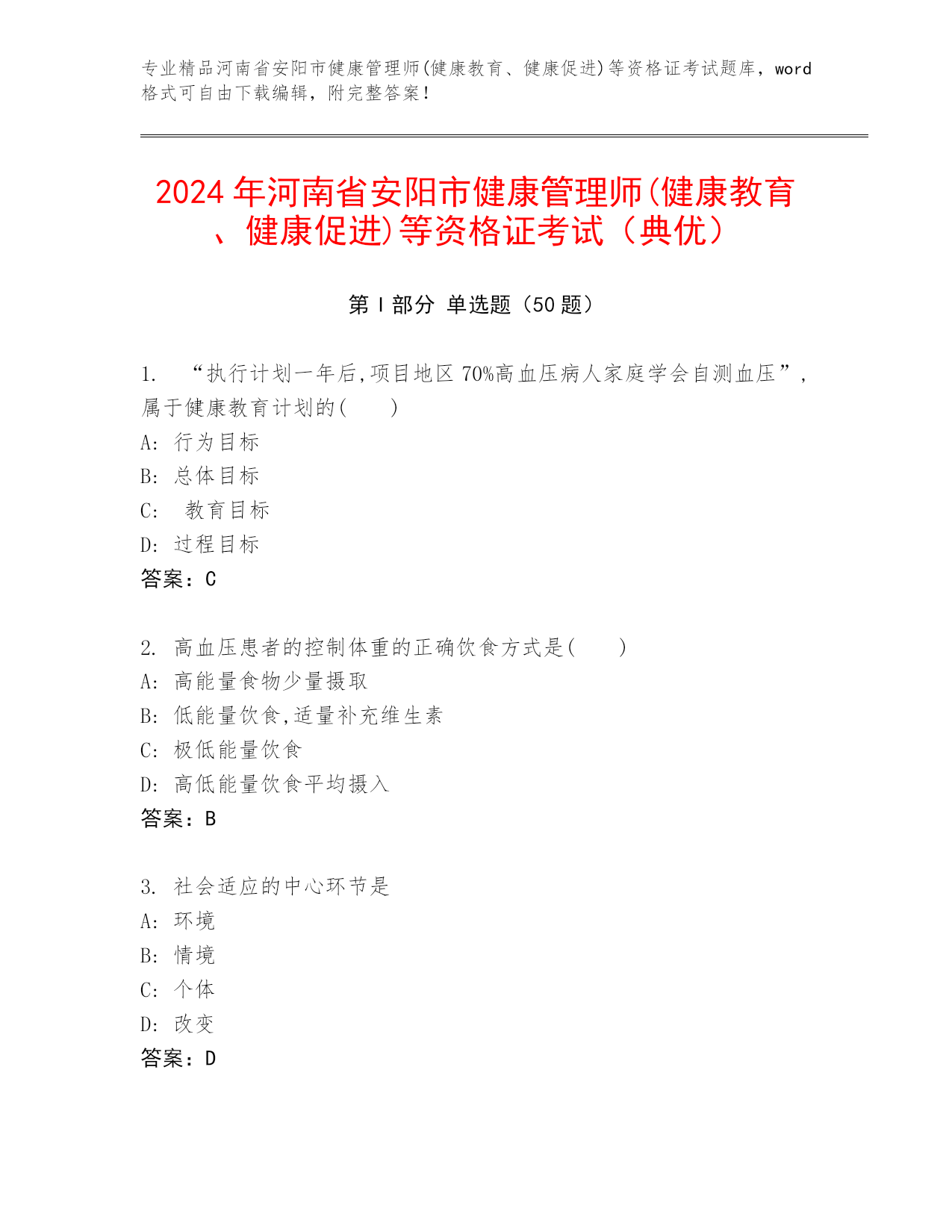 2024年河南省安阳市健康管理师(健康教育、健康促进)等资格证考试(典优).docx