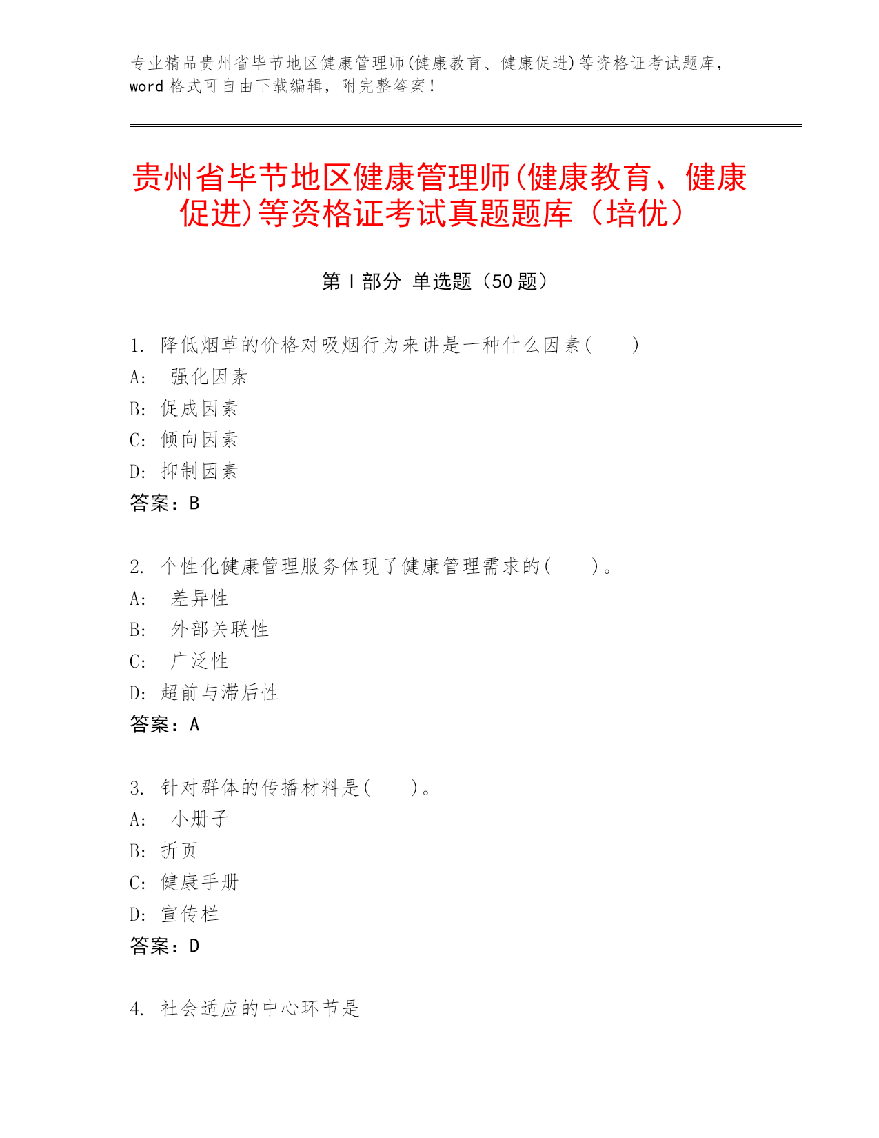 专业精品贵州省毕节地区健康管理师(健康教育、健康促进)等资格证考试题库,word格式可自由下载编辑,附完整答案!贵州省毕节地区健康管理师(健康教育、健康促进)等资格证考试真题题库(培优)第I部分单选题(50题)1.降低烟草的价格对吸烟行为来讲是一种什么因素()A:强化因素B:促成因素C:倾向因素D:抑制因素答案:B2.个性化健康管理服务体现了健康管理需求的()。A:差异性B:外部关联性C:广泛性D:超前与滞后性答案:A3.针对群体的传播材料是()。A:小册子B:折页C:健康手册D:宣传栏答案:D4.社会适