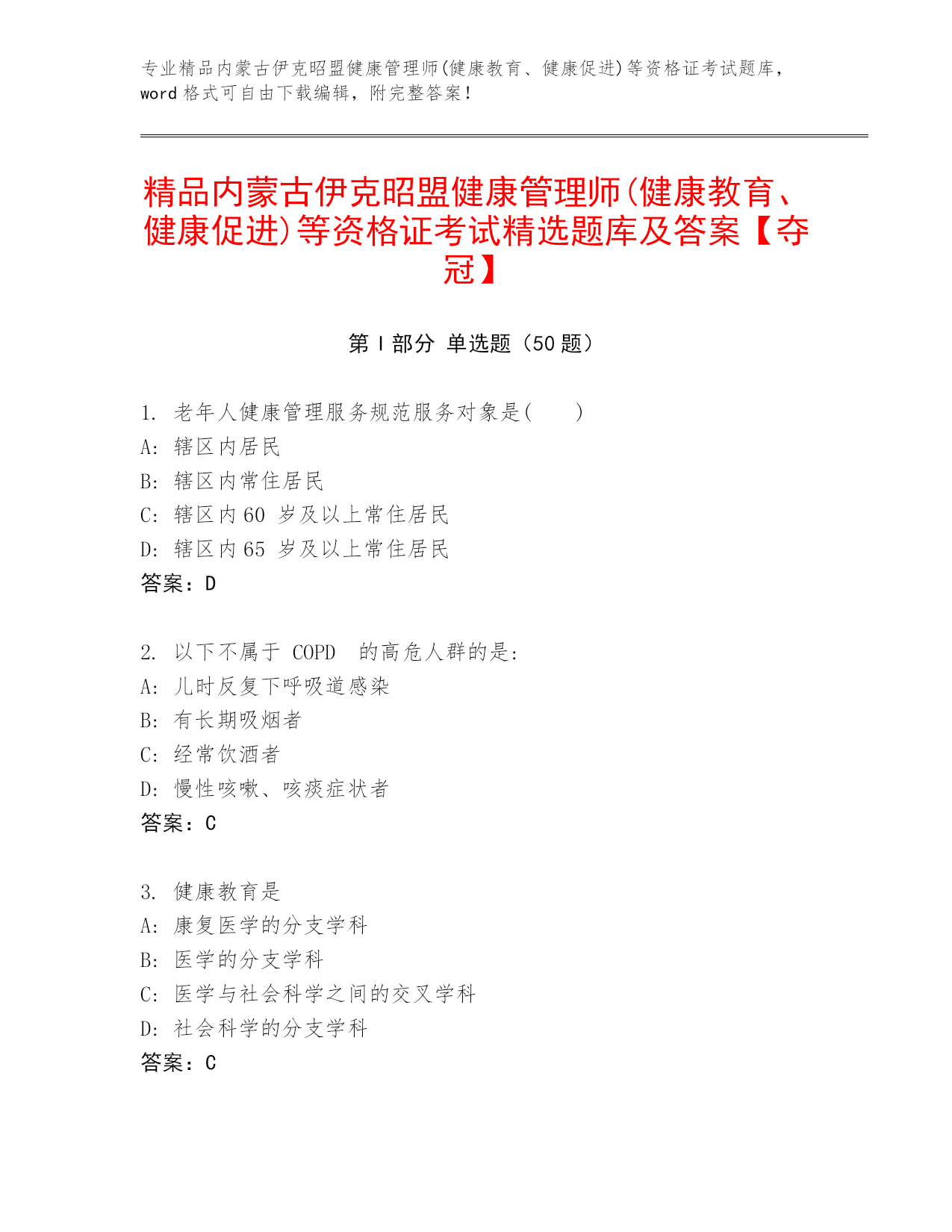 专业精品内蒙古伊克昭盟健康管理师(健康教育、健康促进)等资格证考试题库,word格式可自由下载编辑,附完整答案!精品内蒙古伊克昭盟健康管理师(健康教育、健康促进)等资格证考试精选题库及答案【夺冠】第I部分单选题(50题)1.老年人健康管理服务规范服务对象是()A:辖区内居民B:辖区内常住居民C:辖区内60岁及以上常住居民D:辖区内65岁及以上常住居民答案:D2.以下不属于COPD的高危人群的是:A:儿时反复下呼吸道感染B:有长期吸烟者C:经常饮酒者D:慢性咳嗽、咳痰症状者答案:C3.健康教育是A:康复医学