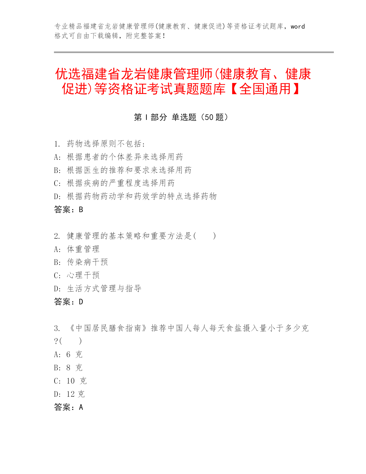 优选福建省龙岩健康管理师(健康教育、健康促进)等资格证考试真题题库【全国通用】.docx