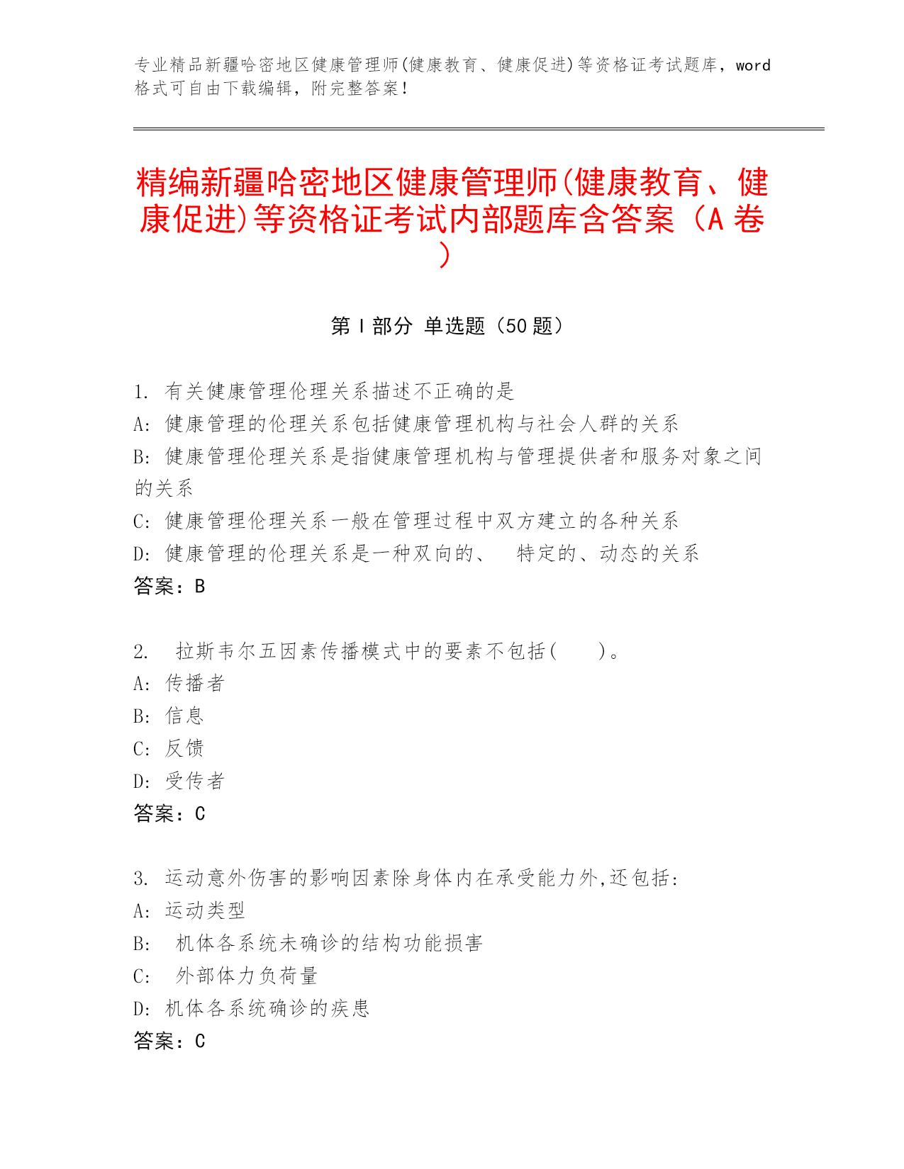 精编新疆哈密地区健康管理师(健康教育、健康促进)等资格证考试内部题库含答案(A卷).docx
