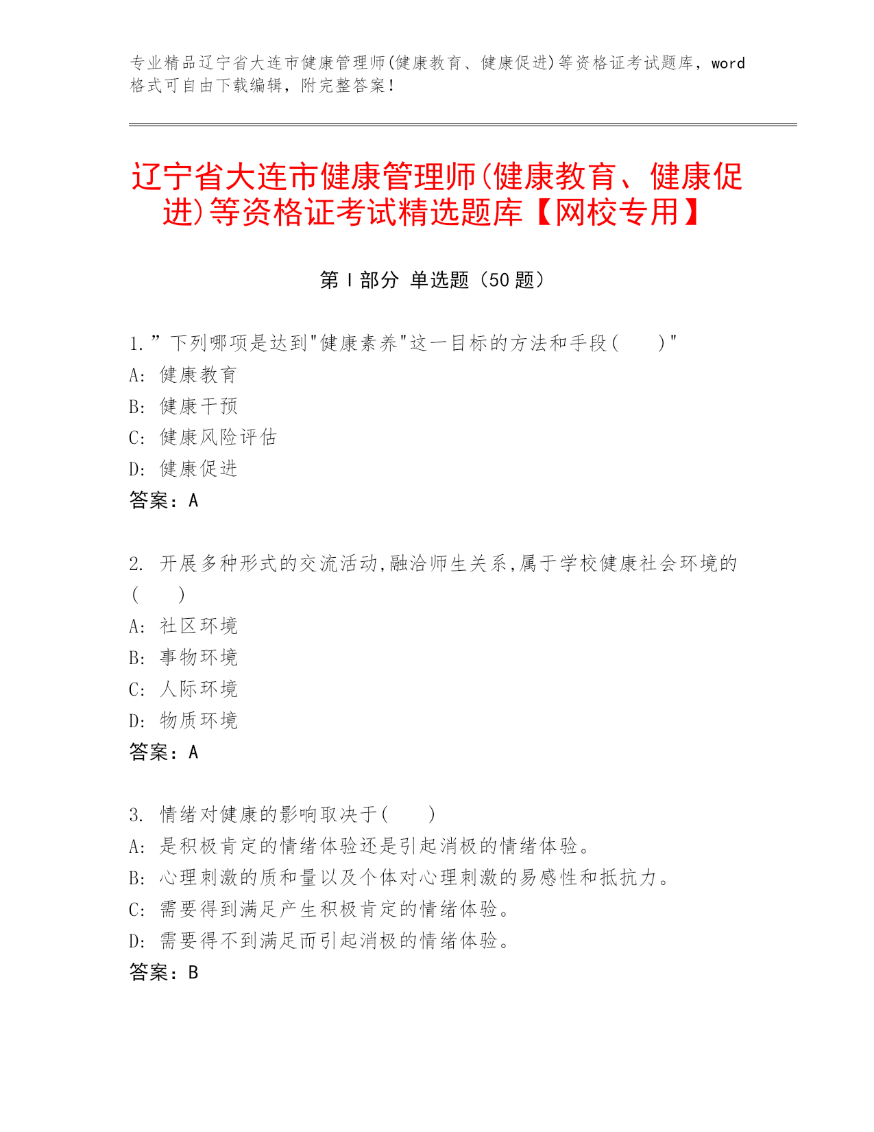 专业精品辽宁省大连市健康管理师(健康教育、健康促进)等资格证考试题库,word格式可自由下载编辑,附完整答案!辽宁省大连市健康管理师(健康教育、健康促进)等资格证考试精选题库【网校专用】第I部分单选题(50题)1.”下列哪项是达到"健康素养"这一目标的方法和手段()"A:健康教育B:健康干预C:健康风险评估D:健康促进答案:A2.开展多种形式的交流活动,融洽师生关系,属于学校健康社会环境的()A:社区环境B:事物环境C:人际环境D:物质环境答案:A3.情绪对健康的影响取决于()A:是积极肯定的情绪体验还是