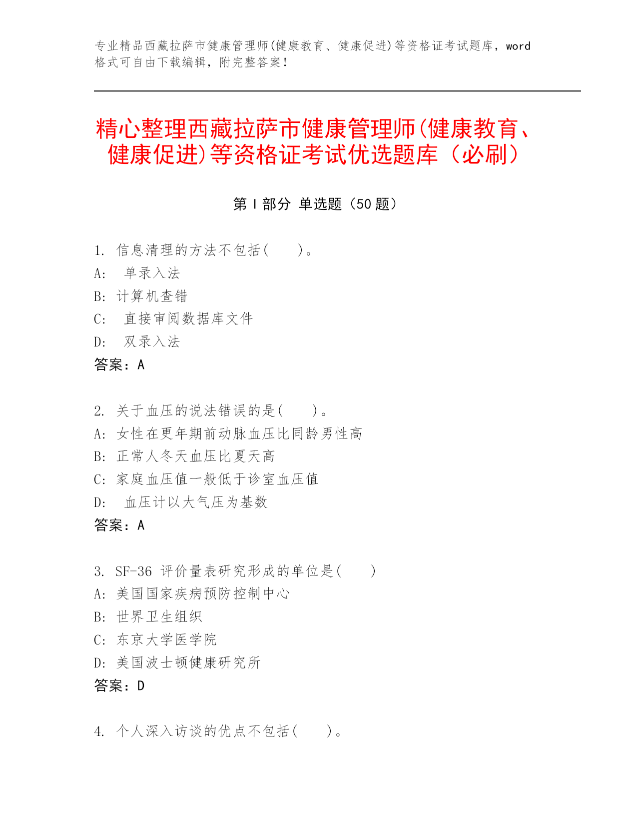 精心整理西藏拉萨市健康管理师(健康教育、健康促进)等资格证考试优选题库(必刷).docx