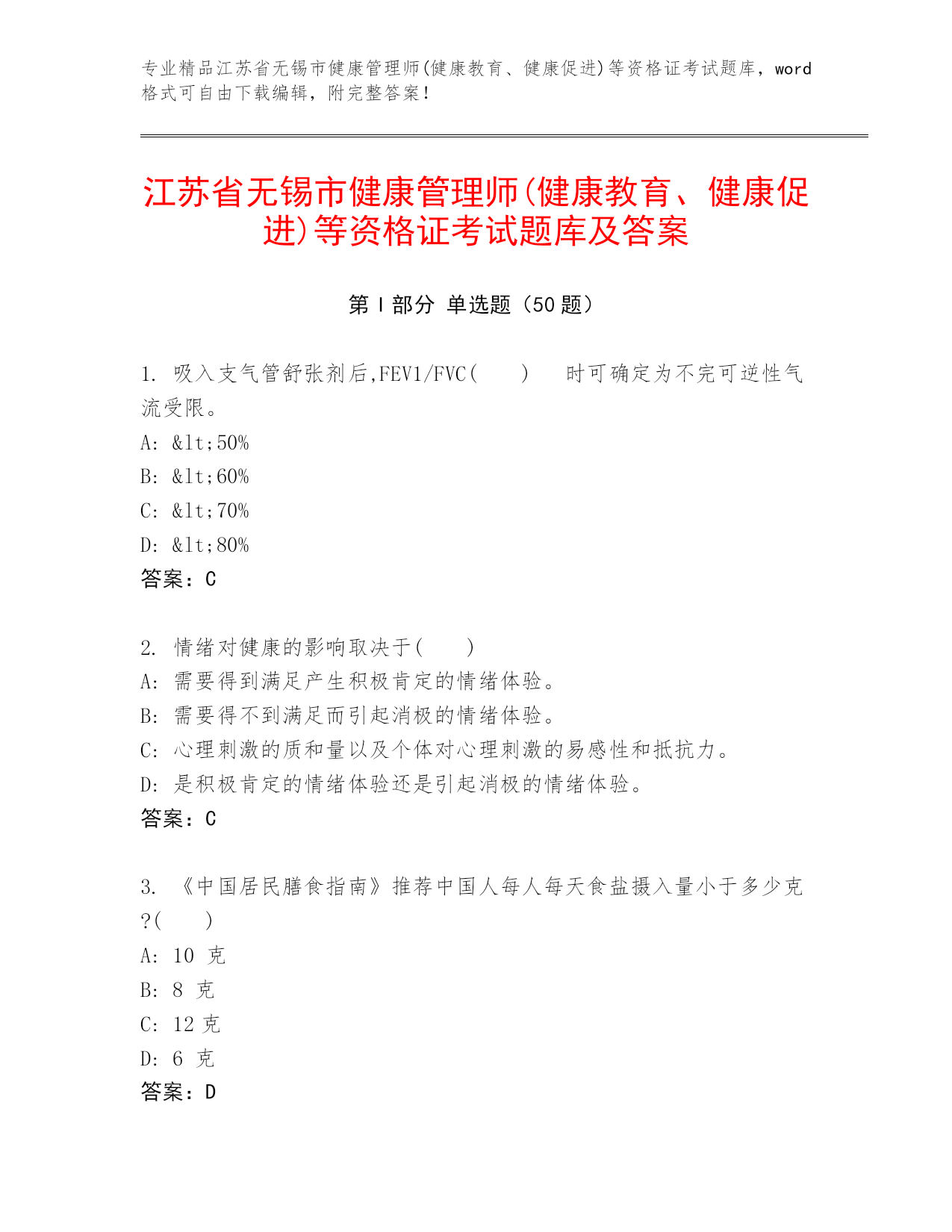 专业精品江苏省无锡市健康管理师(健康教育、健康促进)等资格证考试题库,word格式可自由下载编辑,附完整答案!江苏省无锡市健康管理师(健康教育、健康促进)等资格证考试题库及答案第I部分单选题(50题)1.吸入支气管舒张剂后,FEV1/FVC()时可确定为不完可逆性气流受限。A:<50%B:<60%C:<70%D:<80%答案:C2.情绪对健康的影响取决于()A:需要得到满足产生积极肯定的情绪体验。B:需要得不到满足而引起消极的情绪体验。C:心理刺激的质和量以及个体对心理刺激的易感性