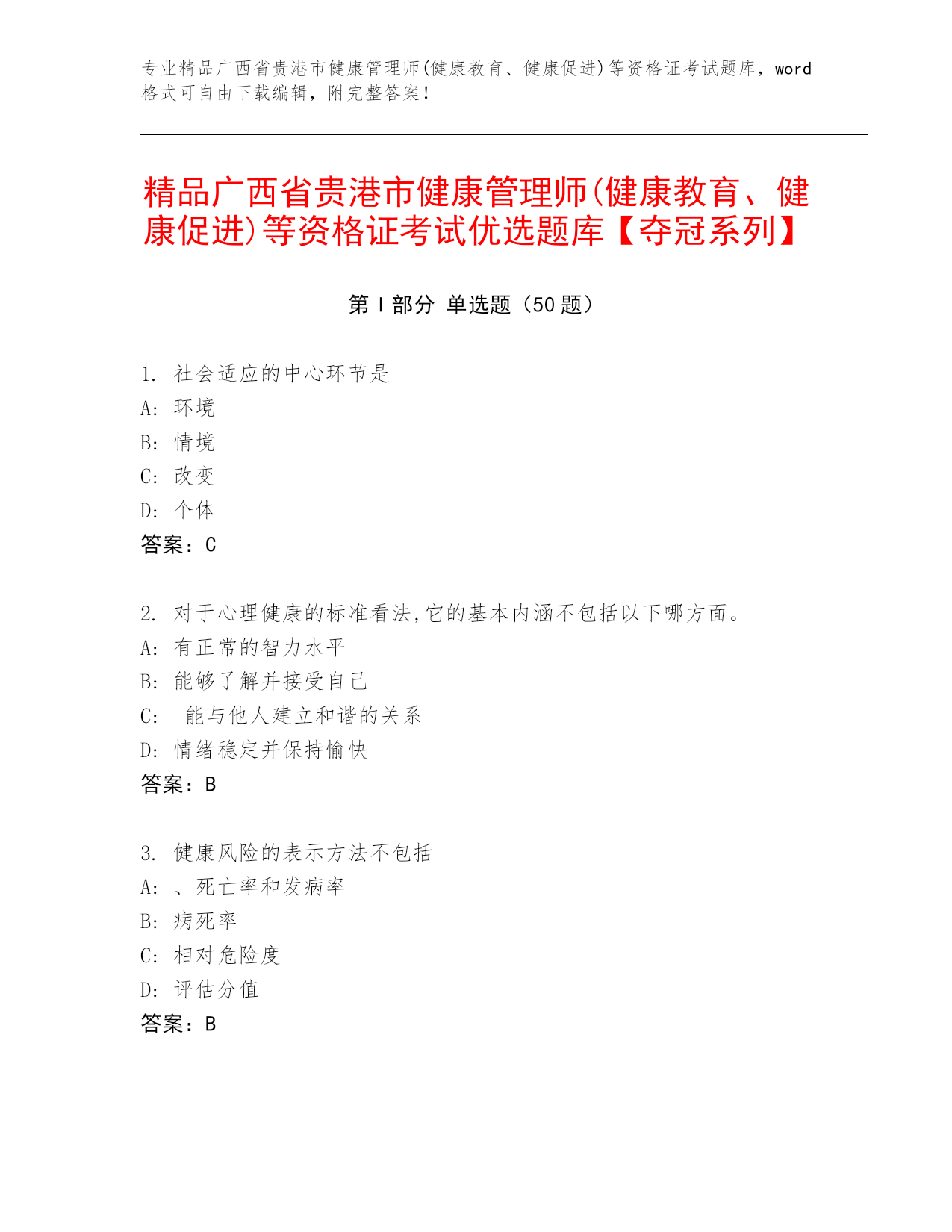 专业精品广西省贵港市健康管理师(健康教育、健康促进)等资格证考试题库,word格式可自由下载编辑,附完整答案!精品广西省贵港市健康管理师(健康教育、健康促进)等资格证考试优选题库【夺冠系列】第I部分单选题(50题)1.社会适应的中心环节是A:环境B:情境C:改变D:个体答案:C2.对于心理健康的标准看法,它的基本内涵不包括以下哪方面。A:有正常的智力水平B:能够了解并接受自己C:能与他人建立和谐的关系D:情绪稳定并保持愉快答案:B3.健康风险的表示方法不包括A:、死亡率和发病率B:病死率C:相对危险度D: