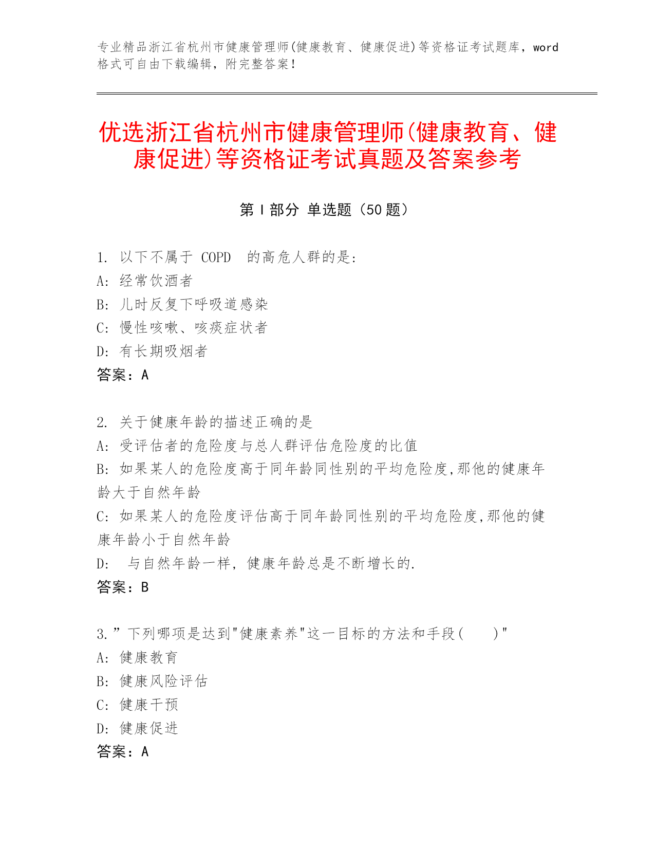 专业精品浙江省杭州市健康管理师(健康教育、健康促进)等资格证考试题库,word格式可自由下载编辑,附完整答案!优选浙江省杭州市健康管理师(健康教育、健康促进)等资格证考试真题及答案参考第I部分单选题(50题)1.以下不属于COPD的高危人群的是:A:经常饮酒者B:儿时反复下呼吸道感染C:慢性咳嗽、咳痰症状者D:有长期吸烟者答案:A2.关于健康年龄的描述正确的是A:受评估者的危险度与总人群评估危险度的比值B:如果某人的危险度高于同年龄同性别的平均危险度,那他的健康年龄大于自然年龄C:如果某人的危险度评估高于