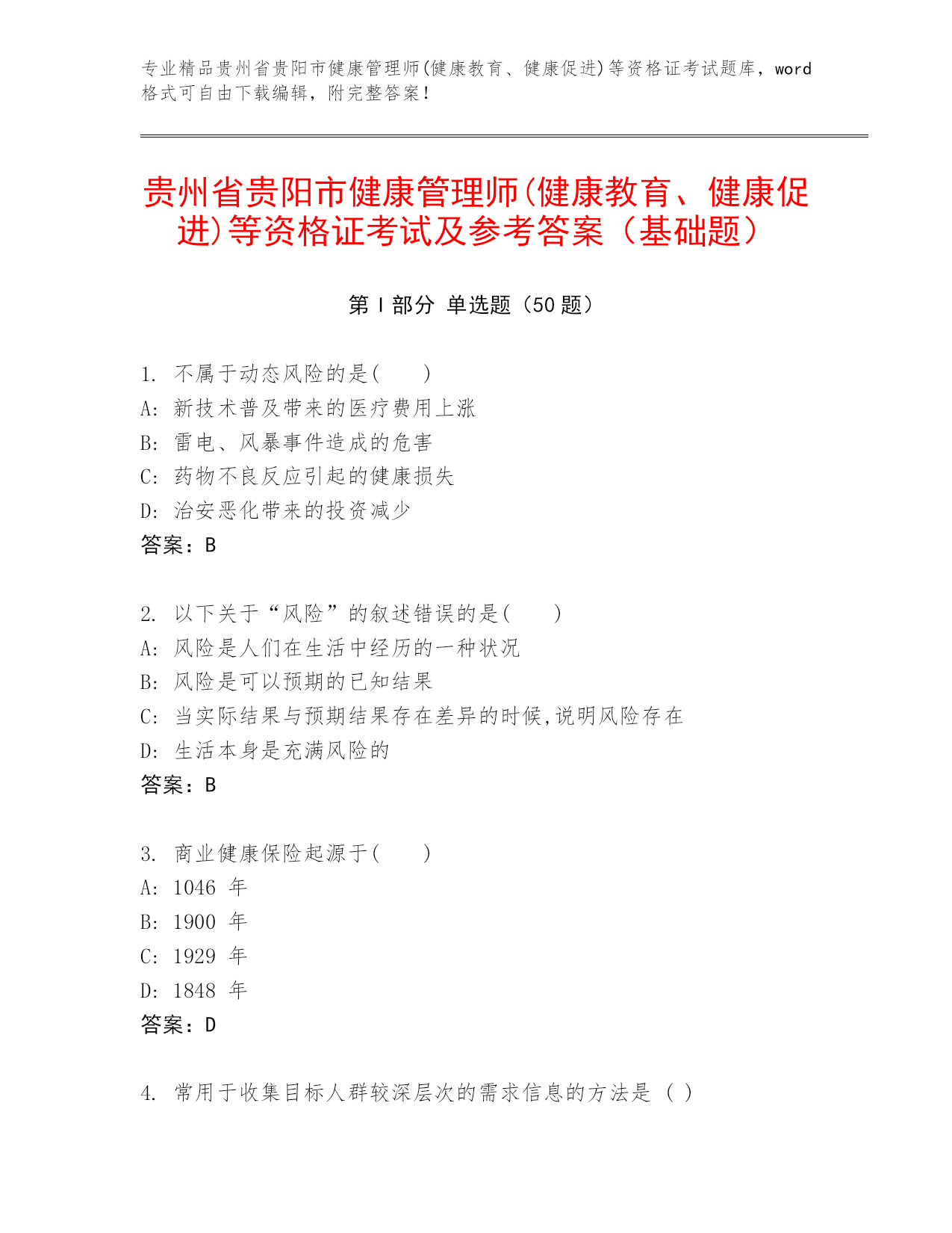 专业精品贵州省贵阳市健康管理师(健康教育、健康促进)等资格证考试题库,word格式可自由下载编辑,附完整答案!贵州省贵阳市健康管理师(健康教育、健康促进)等资格证考试及参考答案(基础题)第I部分单选题(50题)1.不属于动态风险的是()A:新技术普及带来的医疗费用上涨B:雷电、风暴事件造成的危害C:药物不良反应引起的健康损失D:治安恶化带来的投资减少答案:B2.以下关于“风险”的叙述错误的是()A:风险是人们在生活中经历的一种状况B:风险是可以预期的已知结果C:当实际结果与预期结果存在差异的时候,说明风险