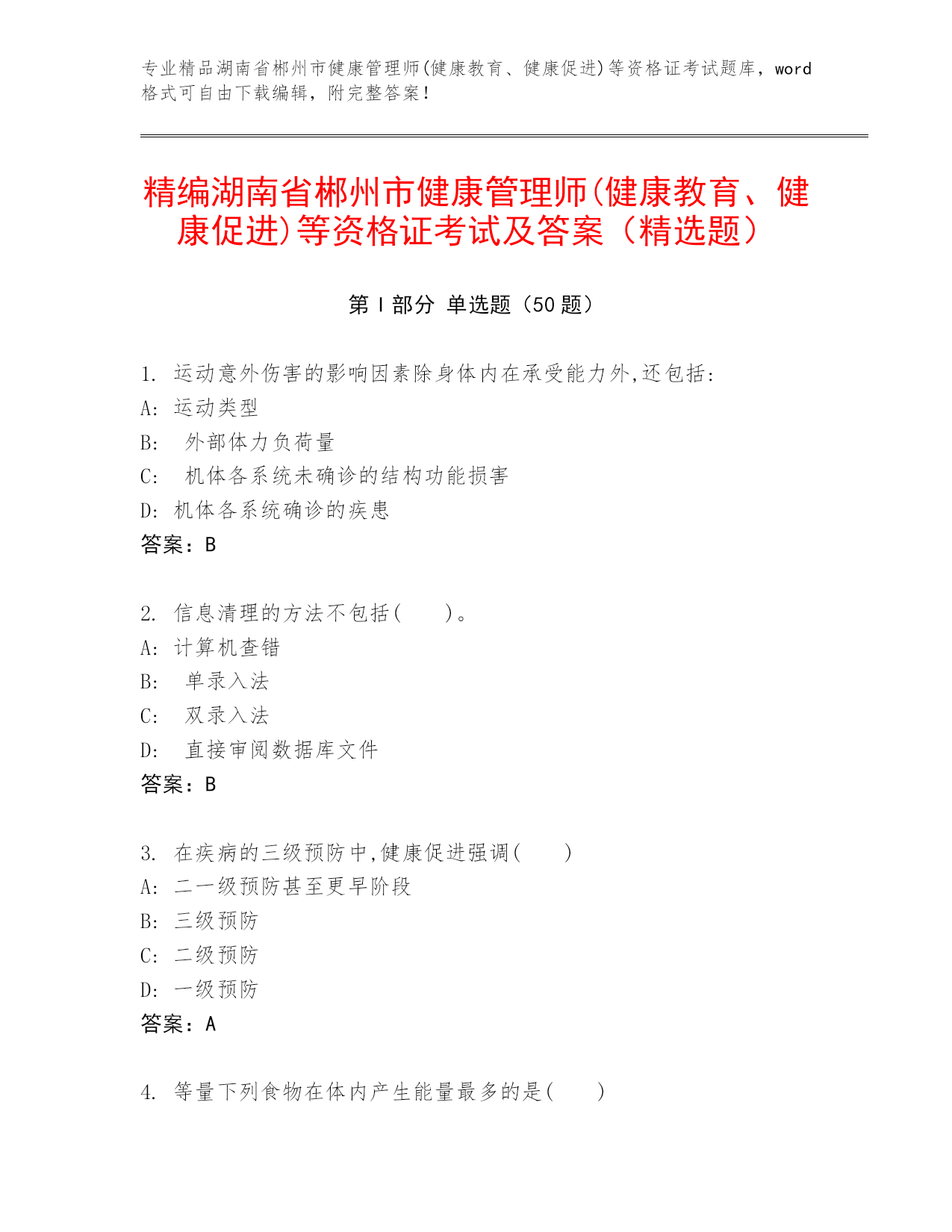 精编湖南省郴州市健康管理师(健康教育、健康促进)等资格证考试及答案(精选题).docx