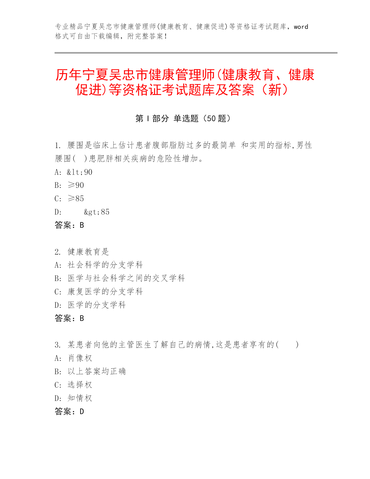 历年宁夏吴忠市健康管理师(健康教育、健康促进)等资格证考试题库及答案(新).docx