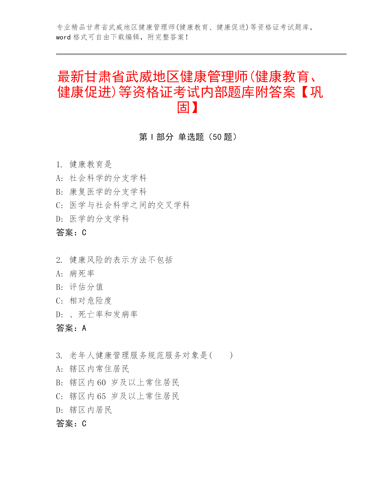 最新甘肃省武威地区健康管理师(健康教育、健康促进)等资格证考试内部题库附答案【巩固】.docx