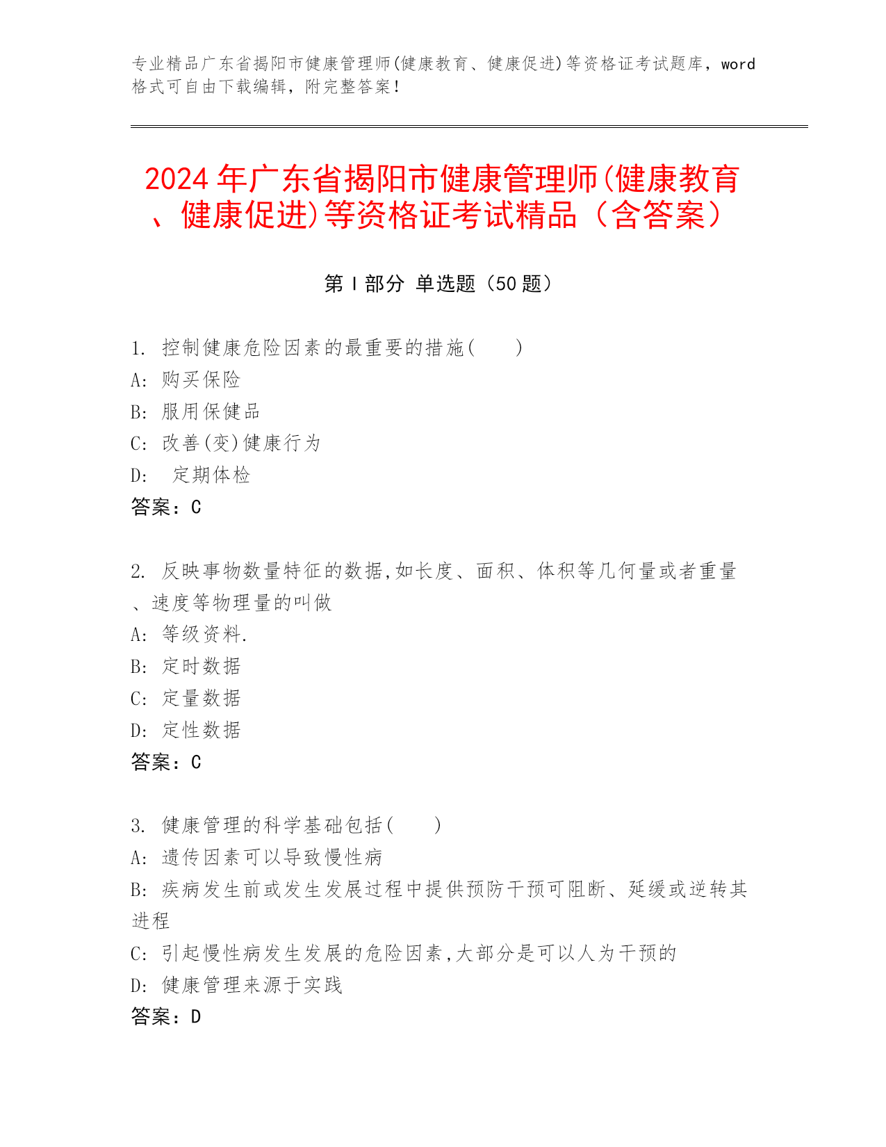 2024年广东省揭阳市健康管理师(健康教育、健康促进)等资格证考试精品(含答案).docx
