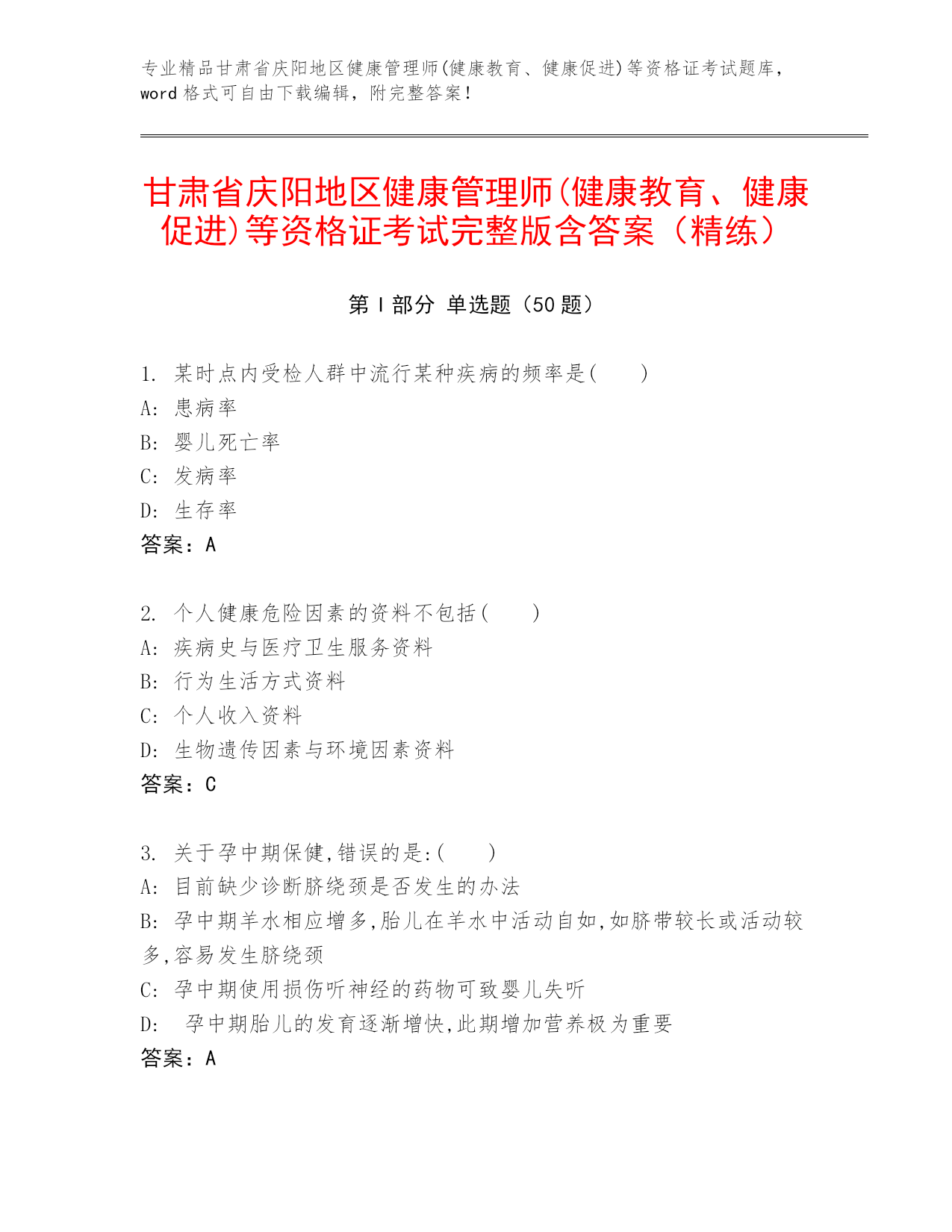 甘肃省庆阳地区健康管理师(健康教育、健康促进)等资格证考试完整版含答案(精练).docx