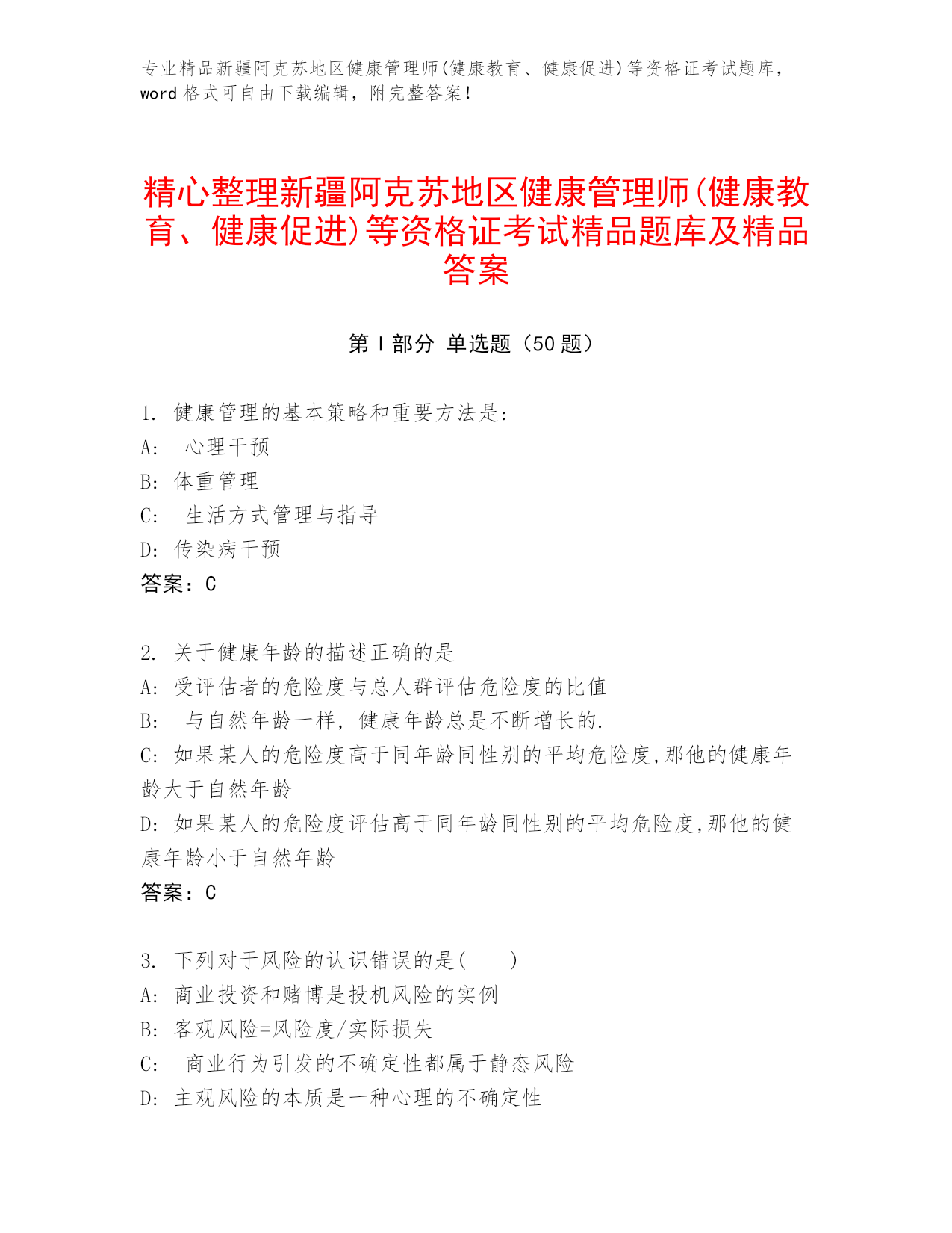 专业精品新疆阿克苏地区健康管理师(健康教育、健康促进)等资格证考试题库,word格式可自由下载编辑,附完整答案!精心整理新疆阿克苏地区健康管理师(健康教育、健康促进)等资格证考试精品题库及精品答案第I部分单选题(50题)1.健康管理的基本策略和重要方法是:A:心理干预B:体重管理C:生活方式管理与指导D:传染病干预答案:C2.关于健康年龄的描述正确的是A:受评估者的危险度与总人群评估危险度的比值B:与自然年龄一样,健康年龄总是不断增长的.C:如果某人的危险度高于同年龄同性别的平均危险度,那他的健康年龄大于