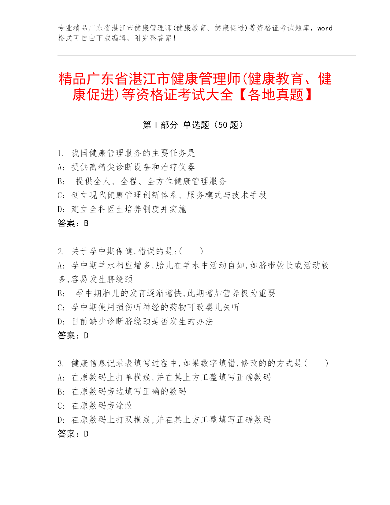 专业精品广东省湛江市健康管理师(健康教育、健康促进)等资格证考试题库,word格式可自由下载编辑,附完整答案!精品广东省湛江市健康管理师(健康教育、健康促进)等资格证考试大全【各地真题】第I部分单选题(50题)1.我国健康管理服务的主要任务是A:提供高精尖诊断设备和治疗仪器B:提供全人、全程、全方位健康管理服务C:创立现代健康管理创新体系、服务模式与技术手段D:建立全科医生培养制度并实施答案:B2.关于孕中期保健,错误的是:()A:孕中期羊水相应增多,胎儿在羊水中活动自如,如脐带较长或活动较多,容易发生脐