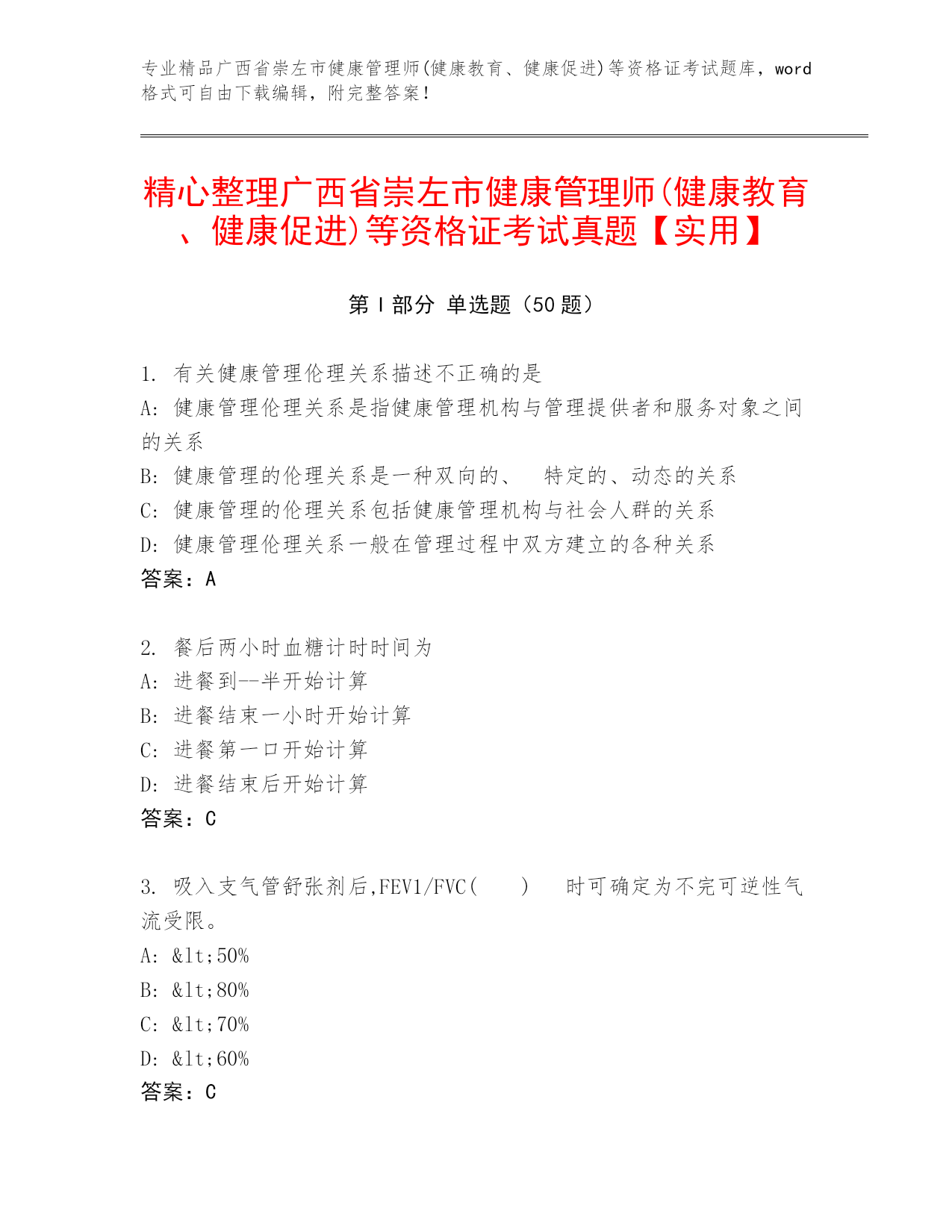 专业精品山西省太原市健康管理师(健康教育、健康促进)等资格证考试题库,word格式可自由下载编辑,附完整答案!完整版山西省太原市健康管理师(健康教育、健康促进)等资格证考试(易错题)第I部分单选题(50题)1.吸入支气管舒张剂后,FEV1/FVC()时可确定为不完可逆性气流受限。A:<60%B:<50%C:<80%D:<70%答案:D2.“生命在于运动,营养贵在平衡”是健康传播中的()A:传播结构B:传播情境C:信息组块D:传播模式答案:C3.高血压患者健康管理服务对象是:A:18