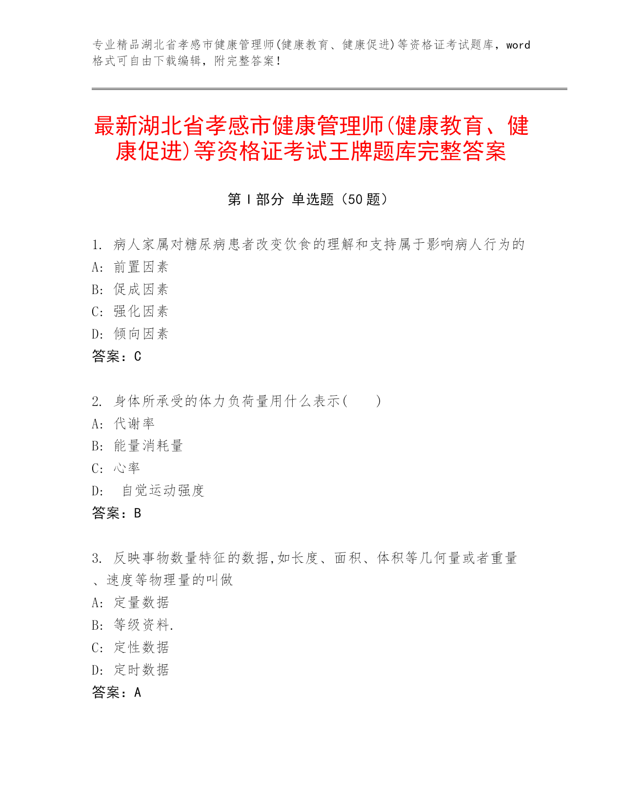 专业精品湖北省孝感市健康管理师(健康教育、健康促进)等资格证考试题库,word格式可自由下载编辑,附完整答案!最新湖北省孝感市健康管理师(健康教育、健康促进)等资格证考试王牌题库完整答案第I部分单选题(50题)1.病人家属对糖尿病患者改变饮食的理解和支持属于影响病人行为的A:前置因素B:促成因素C:强化因素D:倾向因素答案:C2.身体所承受的体力负荷量用什么表示()A:代谢率B:能量消耗量C:心率D:自觉运动强度答案:B3.反映事物数量特征的数据,如长度、面积、体积等几何量或者重量、速度等物理量的叫做A: