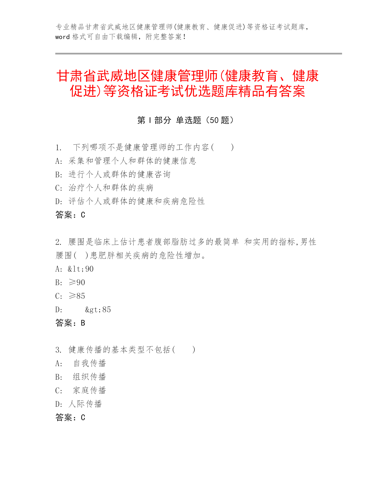 专业精品甘肃省武威地区健康管理师(健康教育、健康促进)等资格证考试题库,word格式可自由下载编辑,附完整答案!甘肃省武威地区健康管理师(健康教育、健康促进)等资格证考试优选题库精品有答案第I部分单选题(50题)1.下列哪项不是健康管理师的工作内容()A:采集和管理个人和群体的健康信息B:进行个人或群体的健康咨询C:治疗个人和群体的疾病D:评估个人或群体的健康和疾病危险性答案:C2.腰围是临床上估计患者腹部脂肪过多的最简单和实用的指标,男性腰围()患肥胖相关疾病的危险性增加。A:<90B:≥90C: