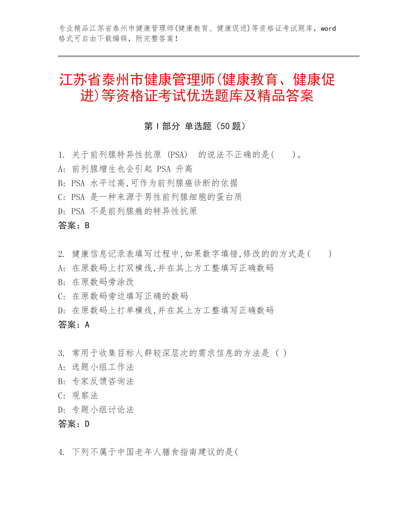 江苏省泰州市健康管理师(健康教育、健康促进)等资格证考试优选题库及精品答案.docx