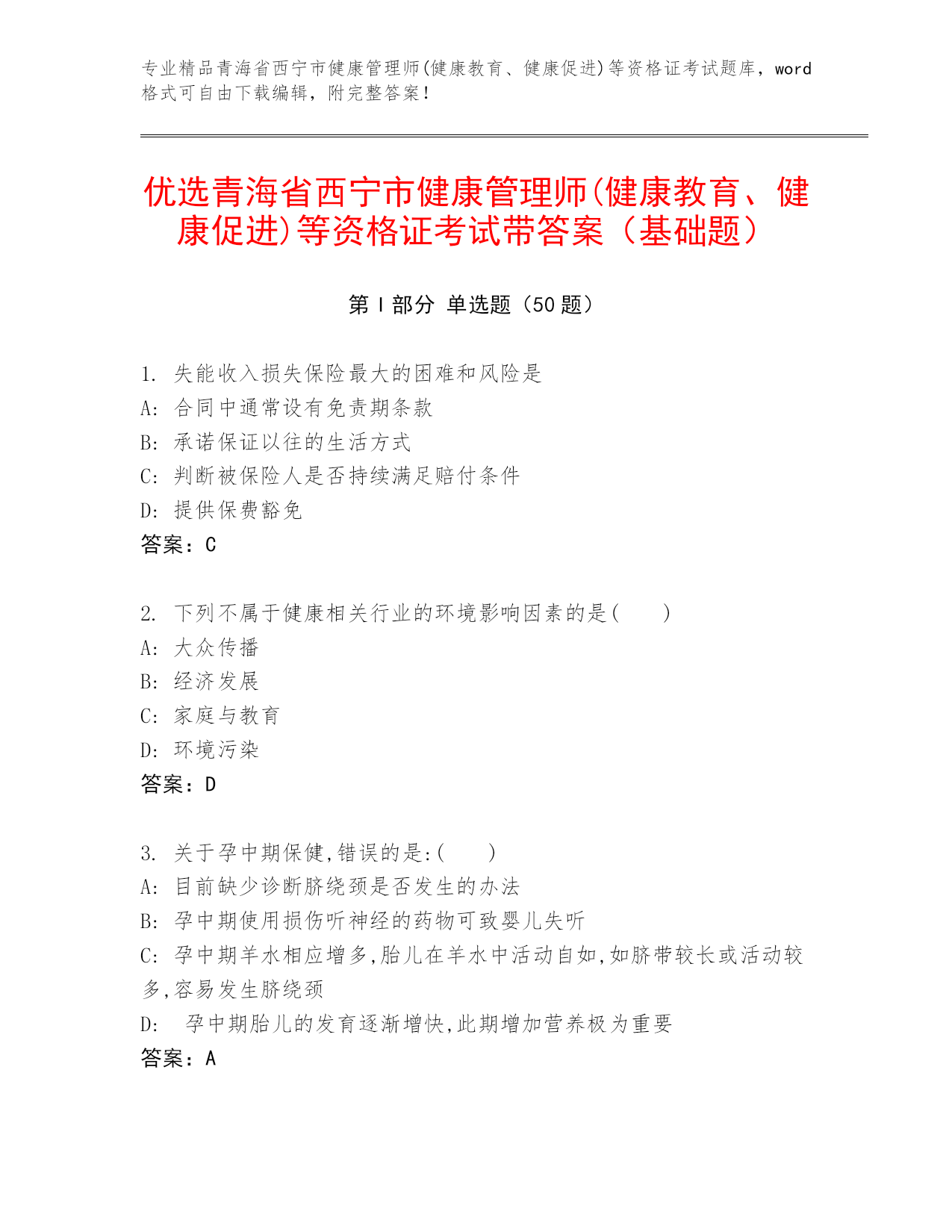 专业精品青海省西宁市健康管理师(健康教育、健康促进)等资格证考试题库,word格式可自由下载编辑,附完整答案!优选青海省西宁市健康管理师(健康教育、健康促进)等资格证考试带答案(基础题)第I部分单选题(50题)1.失能收入损失保险最大的困难和风险是A:合同中通常设有免责期条款B:承诺保证以往的生活方式C:判断被保险人是否持续满足赔付条件D:提供保费豁免答案:C2.下列不属于健康相关行业的环境影响因素的是()A:大众传播B:经济发展C:家庭与教育D:环境污染答案:D3.关于孕中期保健,错误的是:()A:目前