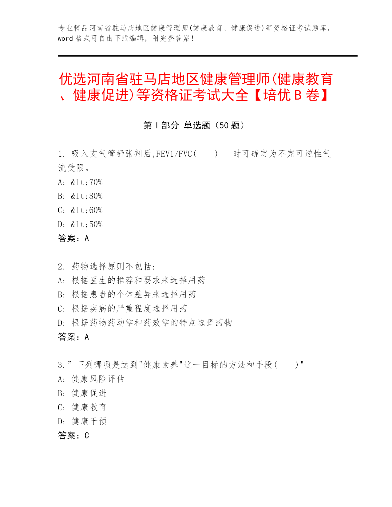 优选河南省驻马店地区健康管理师(健康教育、健康促进)等资格证考试大全【培优B卷】.docx