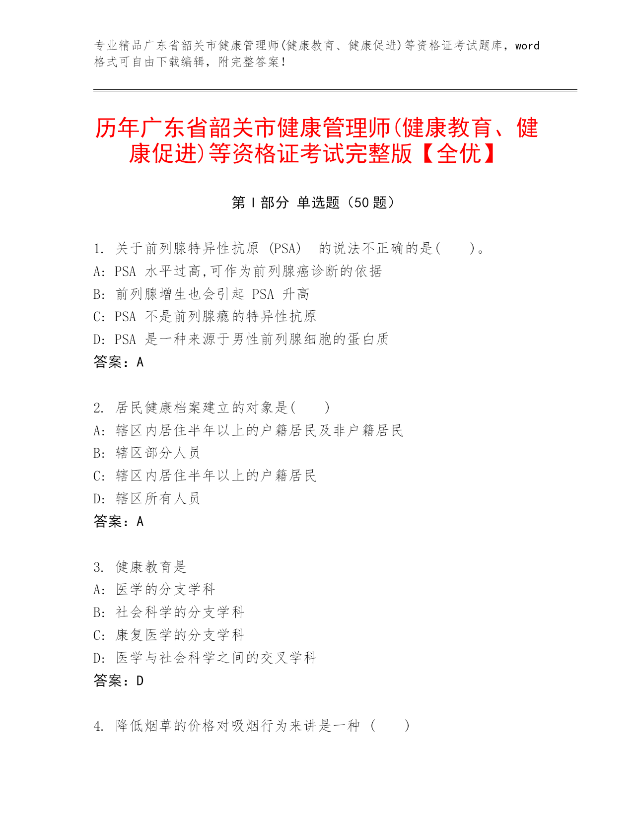 专业精品广东省韶关市健康管理师(健康教育、健康促进)等资格证考试题库,word格式可自由下载编辑,附完整答案!历年广东省韶关市健康管理师(健康教育、健康促进)等资格证考试完整版【全优】第I部分单选题(50题)1.关于前列腺特异性抗原(PSA)的说法不正确的是()。A:PSA水平过高,可作为前列腺癌诊断的依据B:前列腺增生也会引起PSA升高C:PSA不是前列腺瘾的特异性抗原D:PSA是一种来源于男性前列腺细胞的蛋白质答案:A2.居民健康档案建立的对象是()A:辖区内居住半年以上的户籍居民及非户籍居民B:辖区