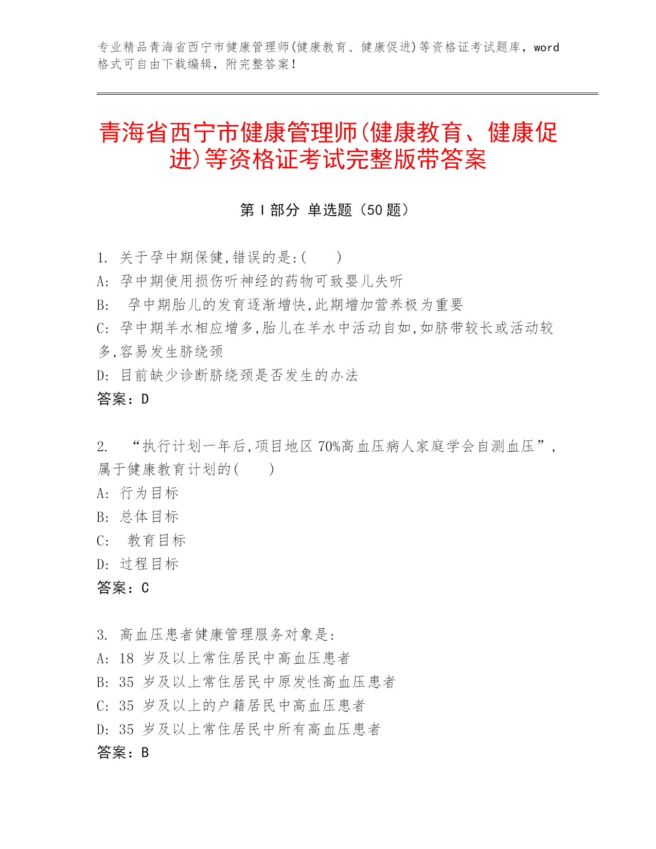 青海省西宁市健康管理师(健康教育、健康促进)等资格证考试完整版带答案.docx
