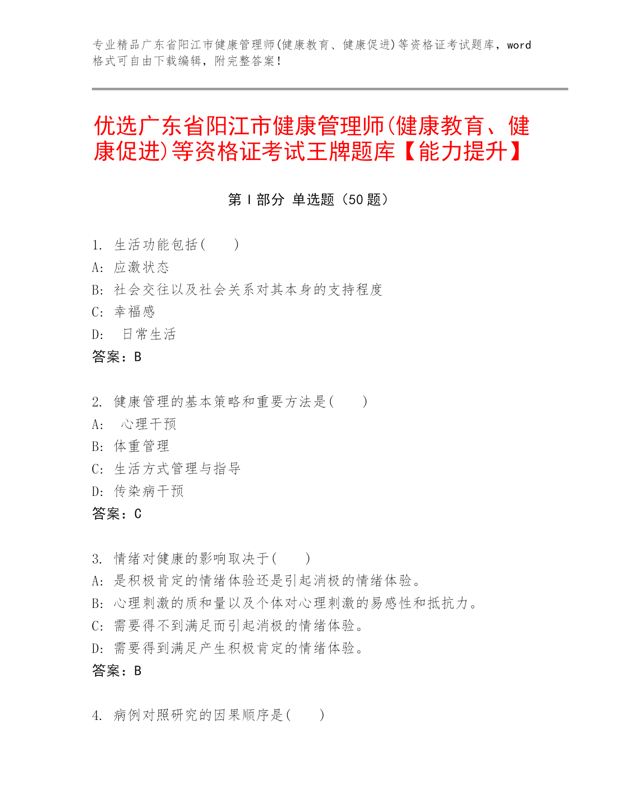优选广东省阳江市健康管理师(健康教育、健康促进)等资格证考试王牌题库【能力提升】.docx