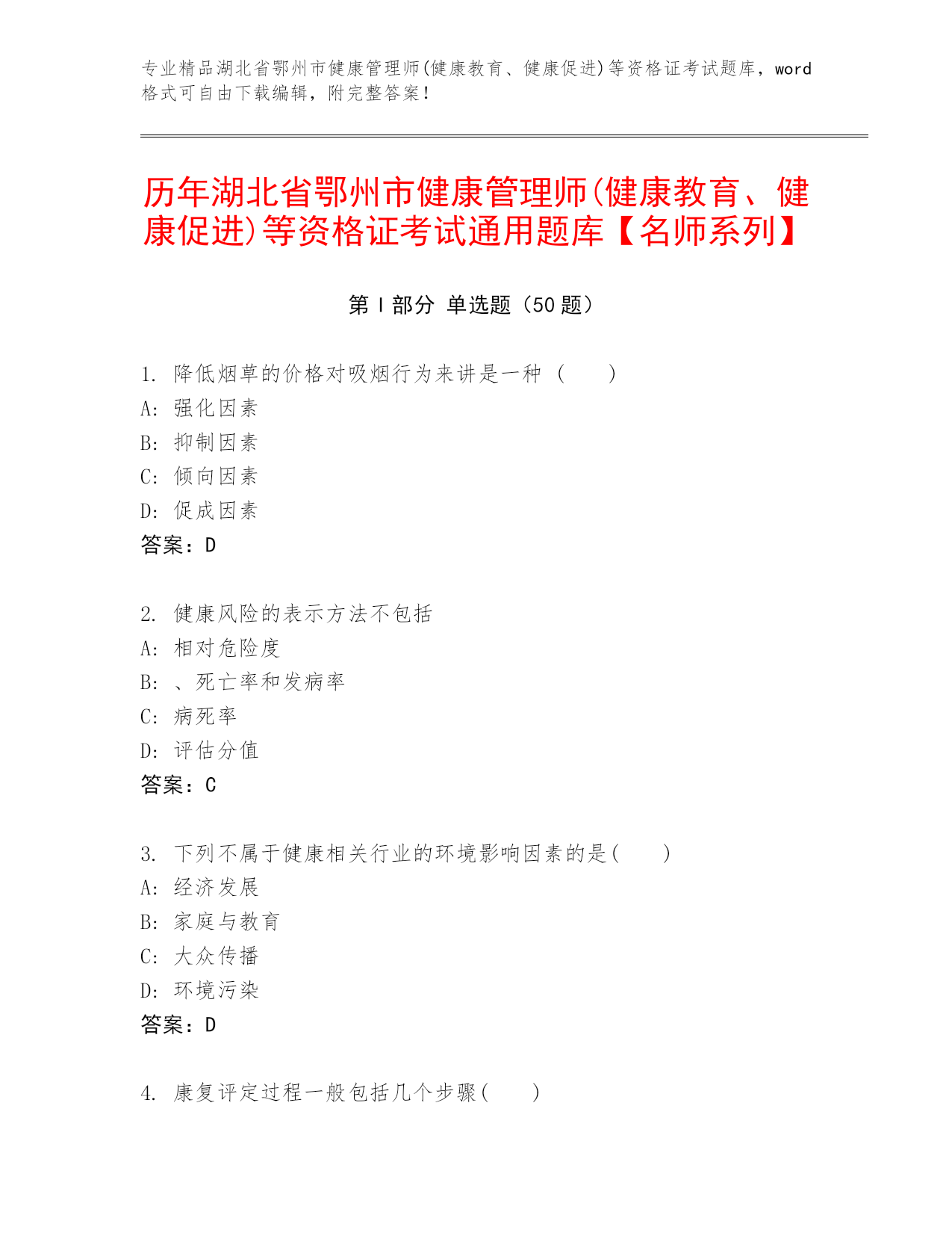 专业精品湖北省鄂州市健康管理师(健康教育、健康促进)等资格证考试题库,word格式可自由下载编辑,附完整答案!历年湖北省鄂州市健康管理师(健康教育、健康促进)等资格证考试通用题库【名师系列】第I部分单选题(50题)1.降低烟草的价格对吸烟行为来讲是一种()A:强化因素B:抑制因素C:倾向因素D:促成因素答案:D2.健康风险的表示方法不包括A:相对危险度B:、死亡率和发病率C:病死率D:评估分值答案:C3.下列不属于健康相关行业的环境影响因素的是()A:经济发展B:家庭与教育C:大众传播D:环境污染答案:D