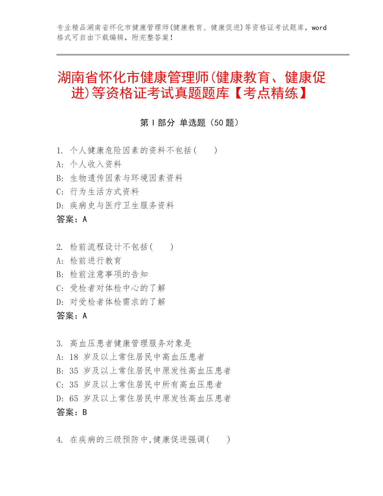 专业精品湖南省怀化市健康管理师(健康教育、健康促进)等资格证考试题库,word格式可自由下载编辑,附完整答案!湖南省怀化市健康管理师(健康教育、健康促进)等资格证考试真题题库【考点精练】第I部分单选题(50题)1.个人健康危险因素的资料不包括()A:个人收入资料B:生物遗传因素与环境因素资料C:行为生活方式资料D:疾病史与医疗卫生服务资料答案:A2.检前流程设计不包括()A:检前进行教育B:检前注意事项的告知C:受检者对体检中心的了解D:对受检者体检需求的了解答案:A3.高血压患者健康管理服务对象是A:1