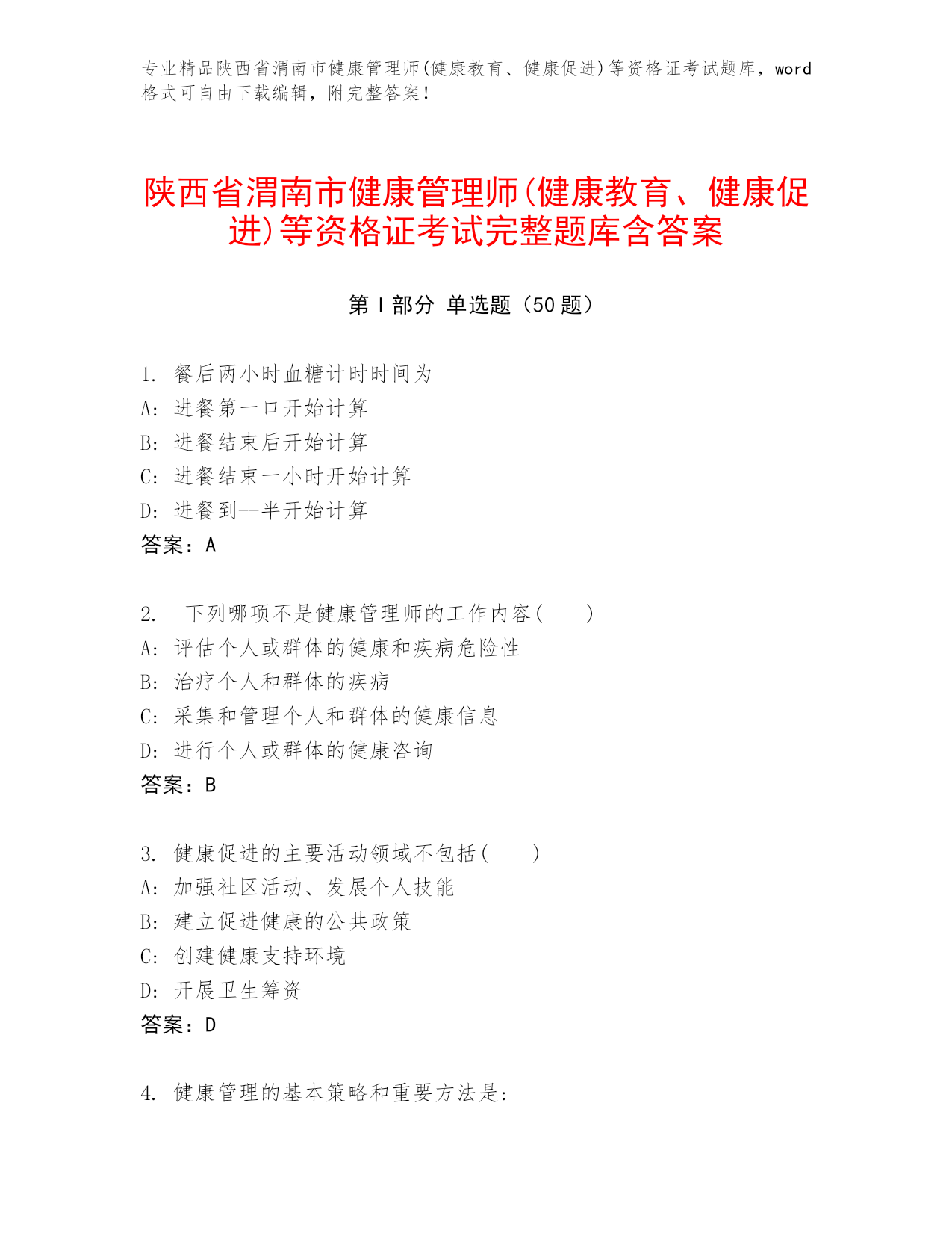 专业精品陕西省渭南市健康管理师(健康教育、健康促进)等资格证考试题库,word格式可自由下载编辑,附完整答案!陕西省渭南市健康管理师(健康教育、健康促进)等资格证考试完整题库含答案第I部分单选题(50题)1.餐后两小时血糖计时时间为A:进餐第一口开始计算B:进餐结束后开始计算C:进餐结束一小时开始计算D:进餐到--半开始计算答案:A2.下列哪项不是健康管理师的工作内容()A:评估个人或群体的健康和疾病危险性B:治疗个人和群体的疾病C:采集和管理个人和群体的健康信息D:进行个人或群体的健康咨询答案:B3.健